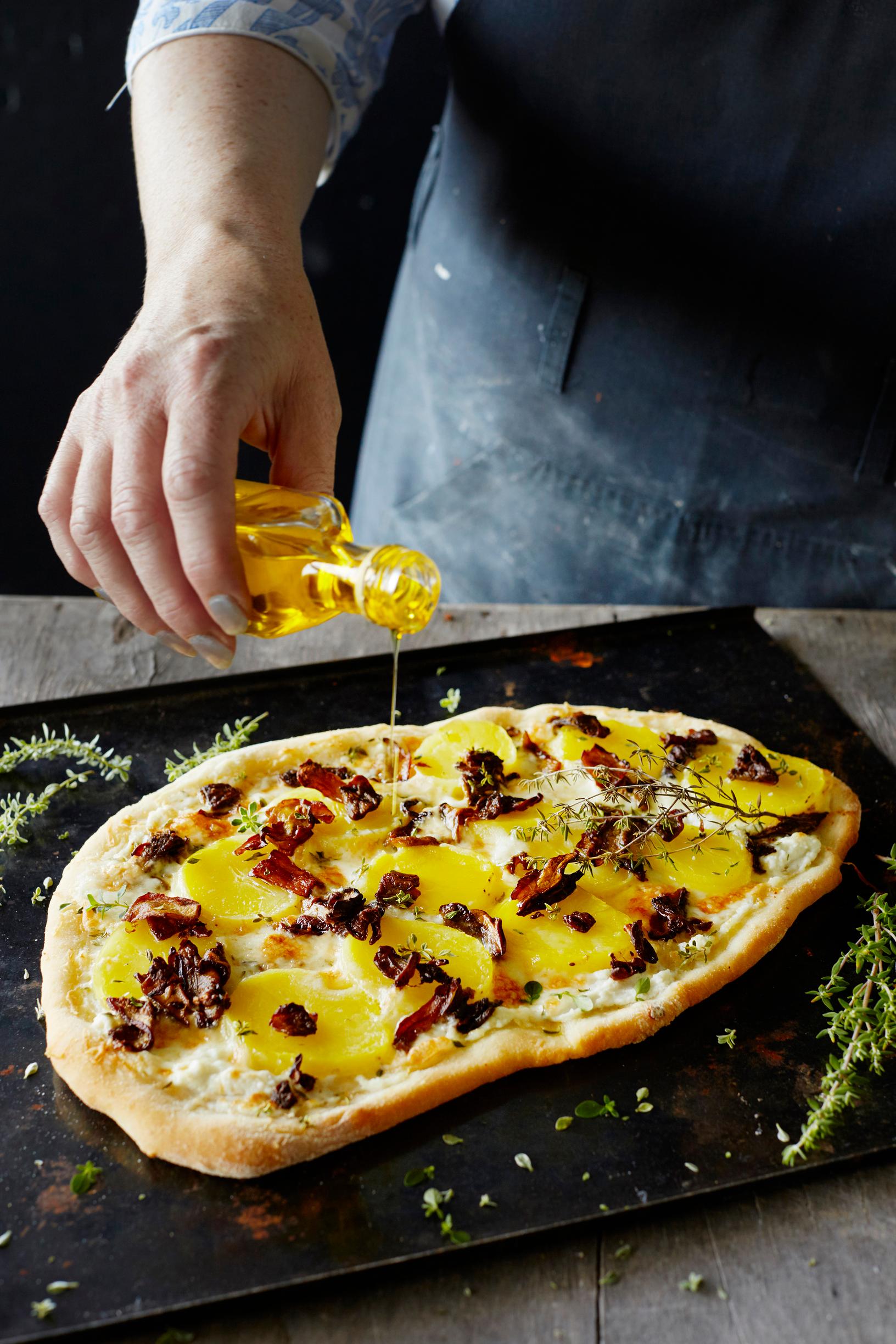 - Paista uunissa 8 minuuttia. Lisää kuuman tattipizzan päälle tryffeliöljyä. Tarjoa heti.