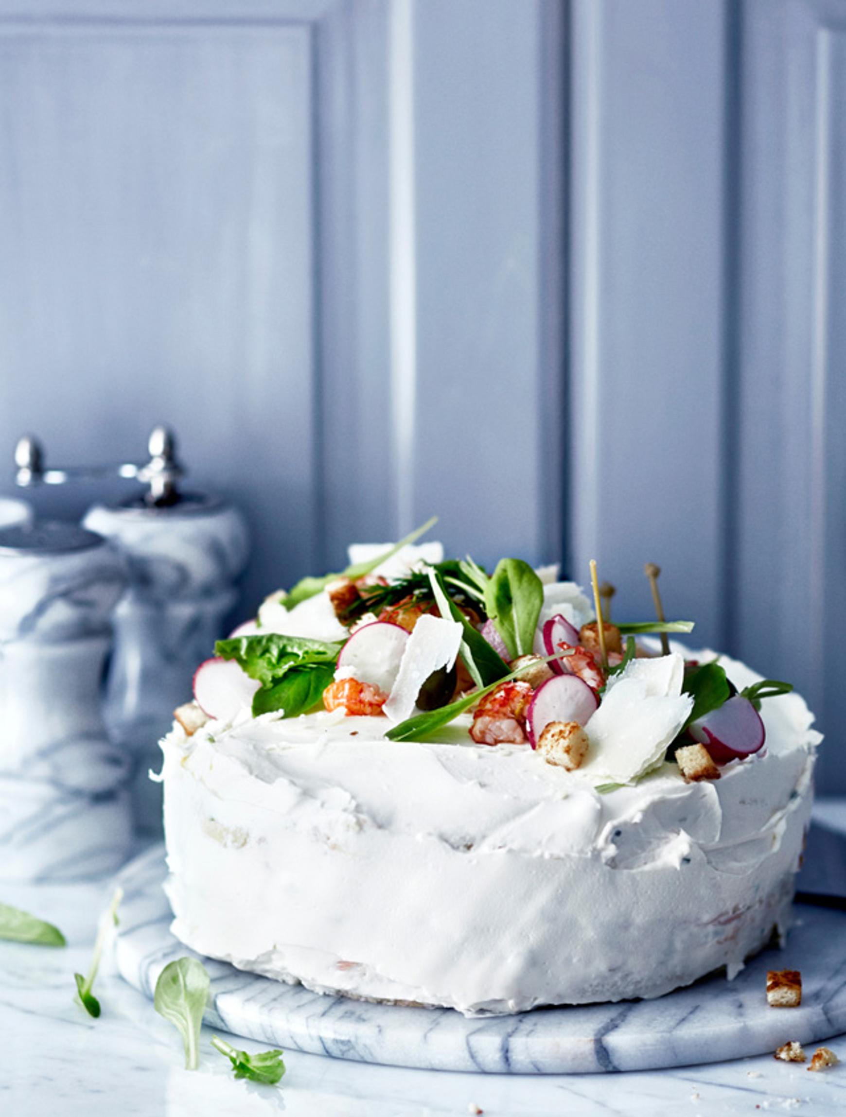 - Koristele kalavoileipäkakku ronskisti leipäkuutioilla, jokiravuilla, retiisiviipaleilla, parmesaanilla ja versoilla.