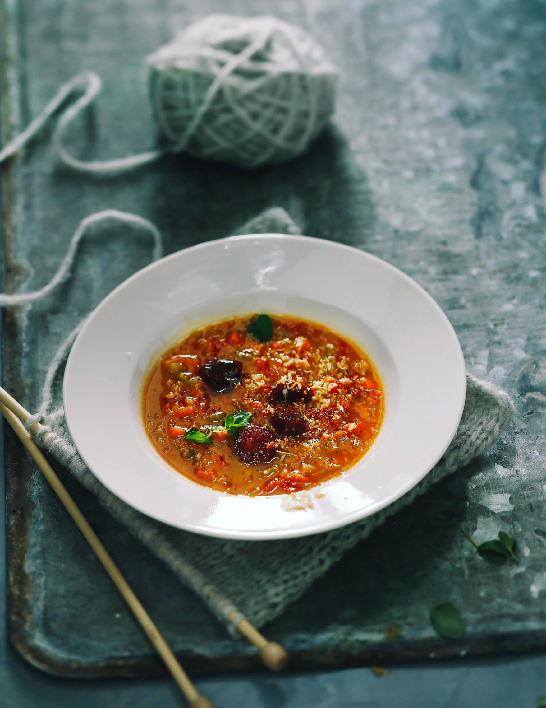 Tämä linssikeitto on täynnä ihania makuja: niitä tuovat paprika, fenkolinsiemenet, varsiselleri, oregano ja punaviinietikka. Valmiin keiton pinnalle lisätään paahdettuja chorizo-paloja ja piparjuuriraastetta. Kasvissyöjät voivat paahtaa makkaranpalojen tilalle vaikkapa siemeniä.