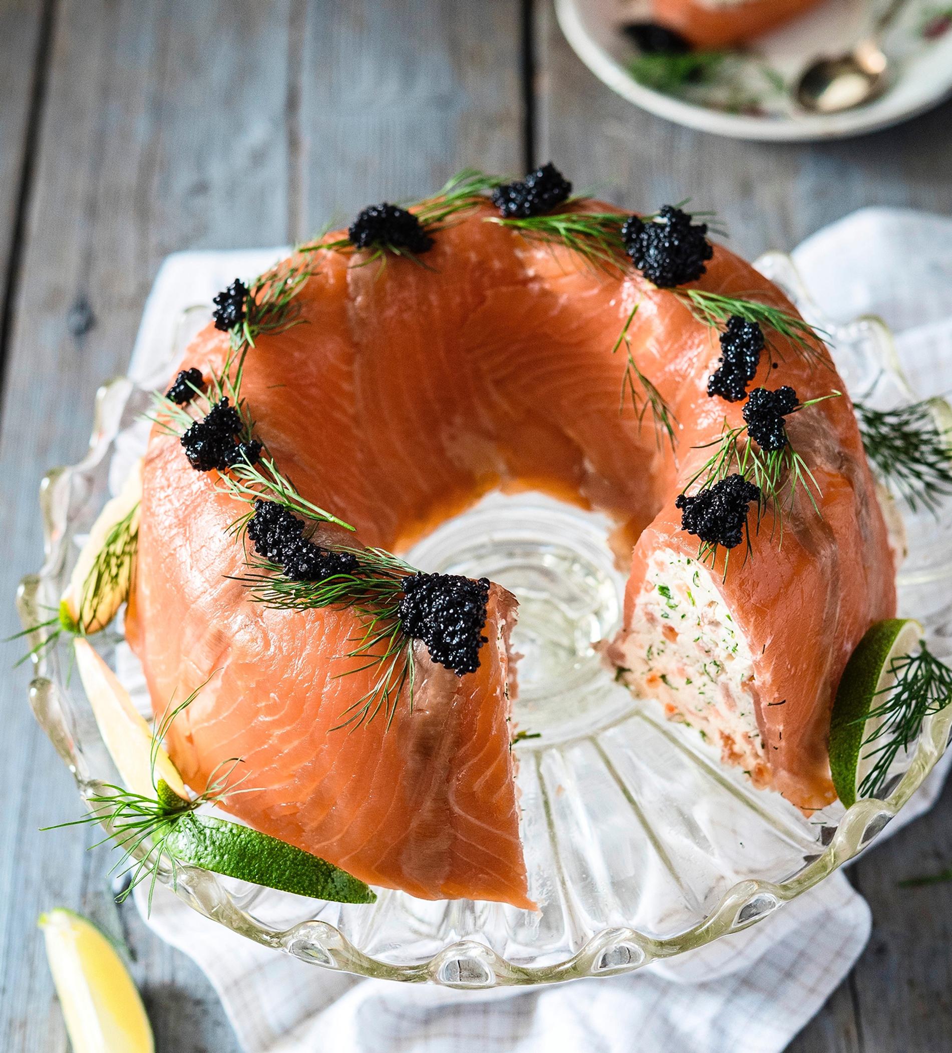 Korvaa joulupöydän kalaruoat hyydytettävällä lohimoussella, jossa maistuvat mäti ja piparjuuri. Näyttävä kakku on kätevä valmistaa pari päivää ennen tarjoilua.