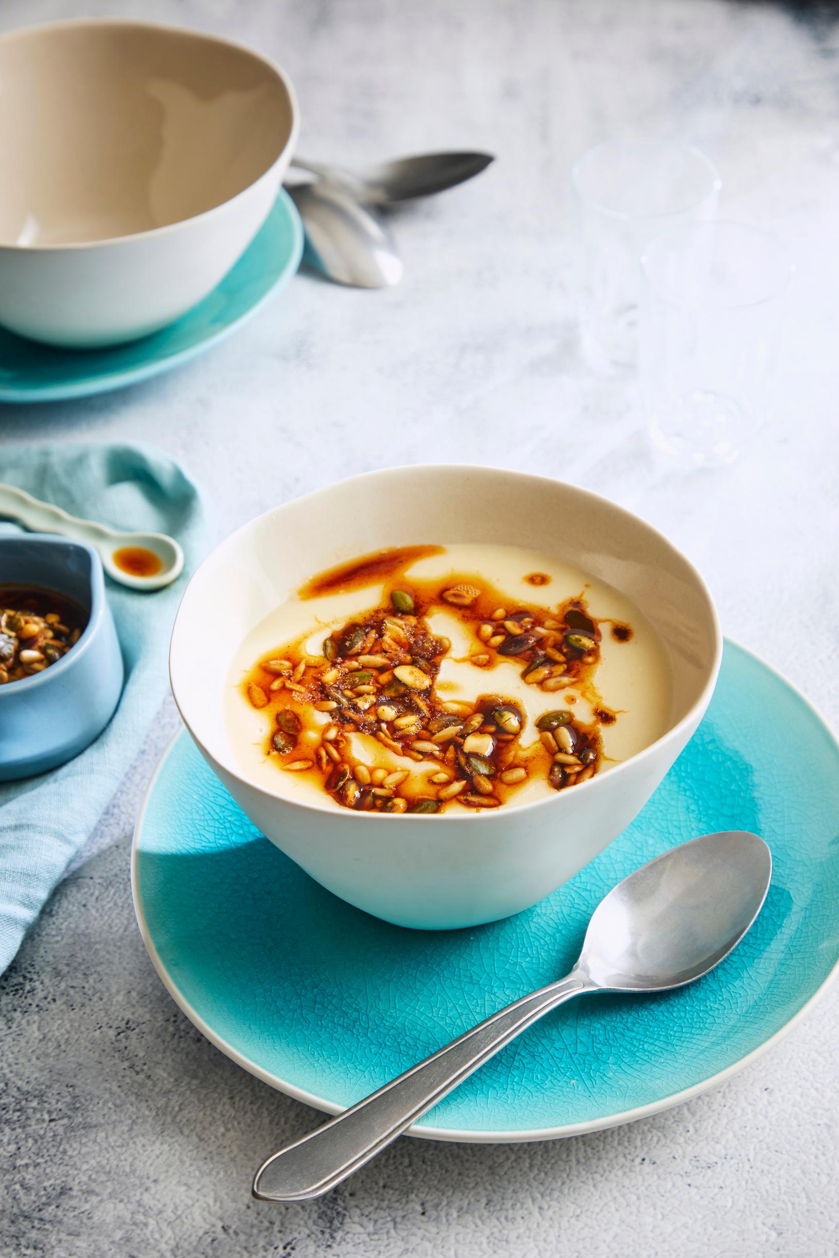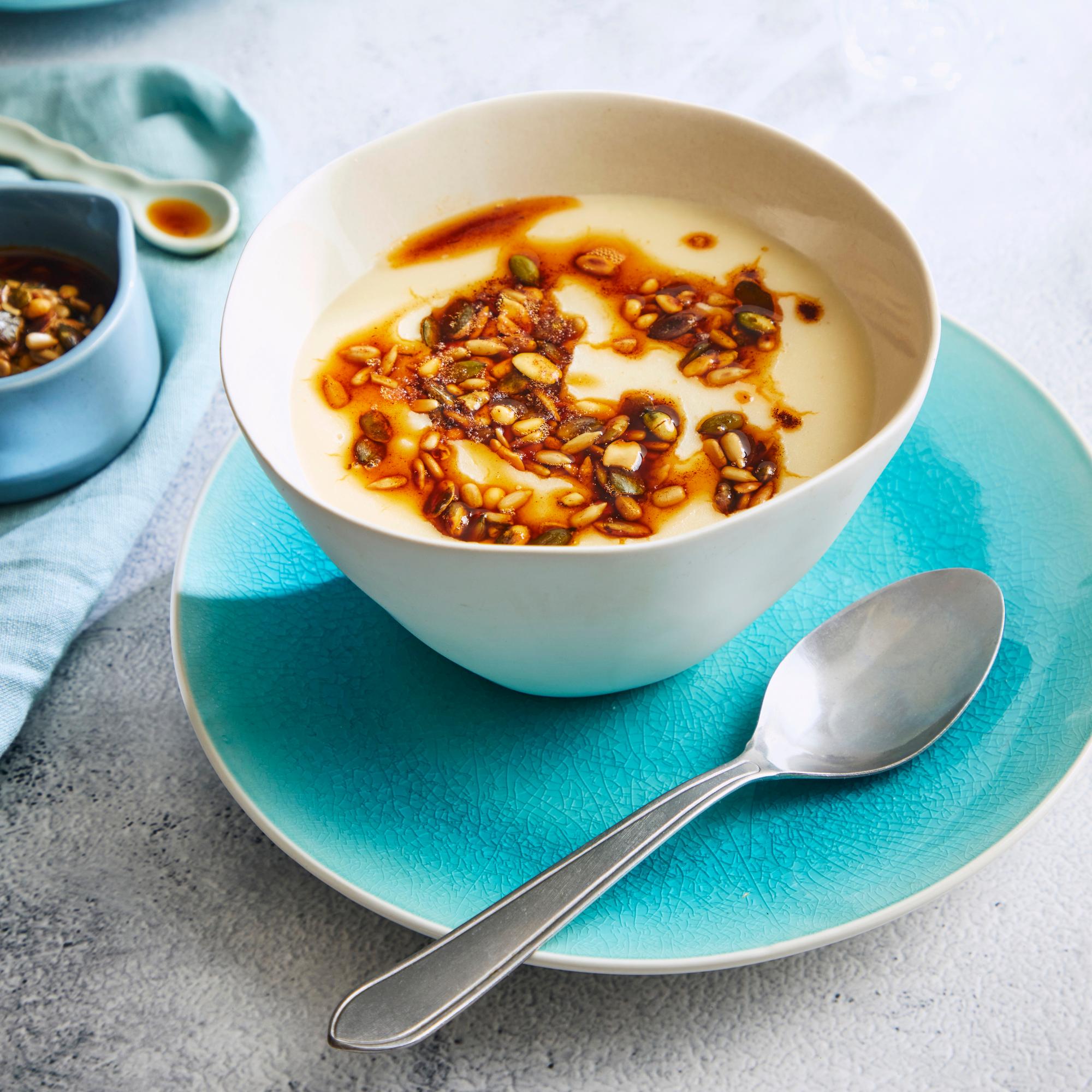 - Jaa keitto kulhoihin ja lusikoi lämmintä siemenseosta pinnalle.