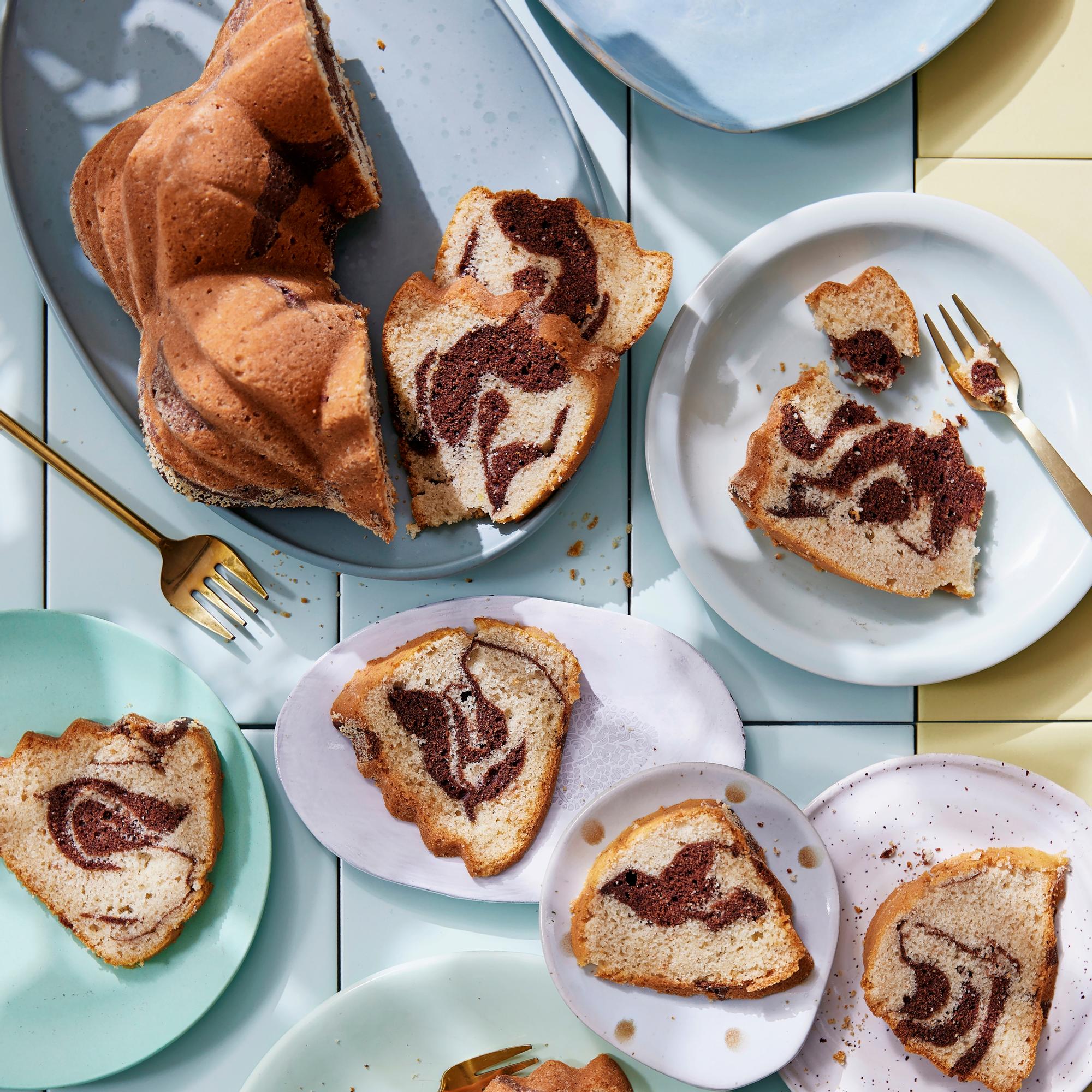 - Voitele ja korppujauhota rengaskakkuvuoka (2 l) ja lusikoi taikinoita vuorotellen molemmista kulhoista vuokaan.