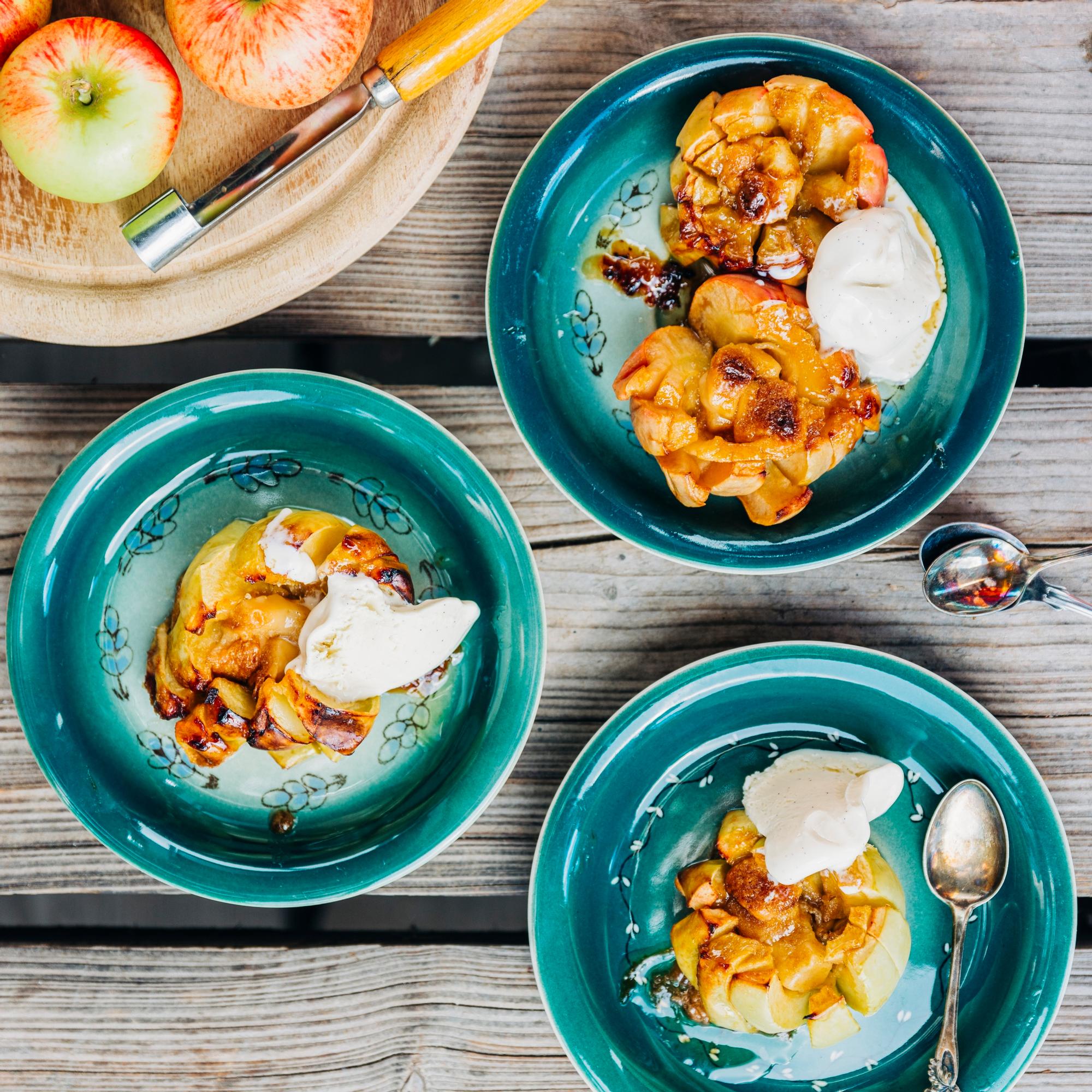 - Paista 200 asteessa, kunnes omenat ovat kypsiä, noin 30 minuuttia. Tarjoa lämpiminä jäätelön kanssa.