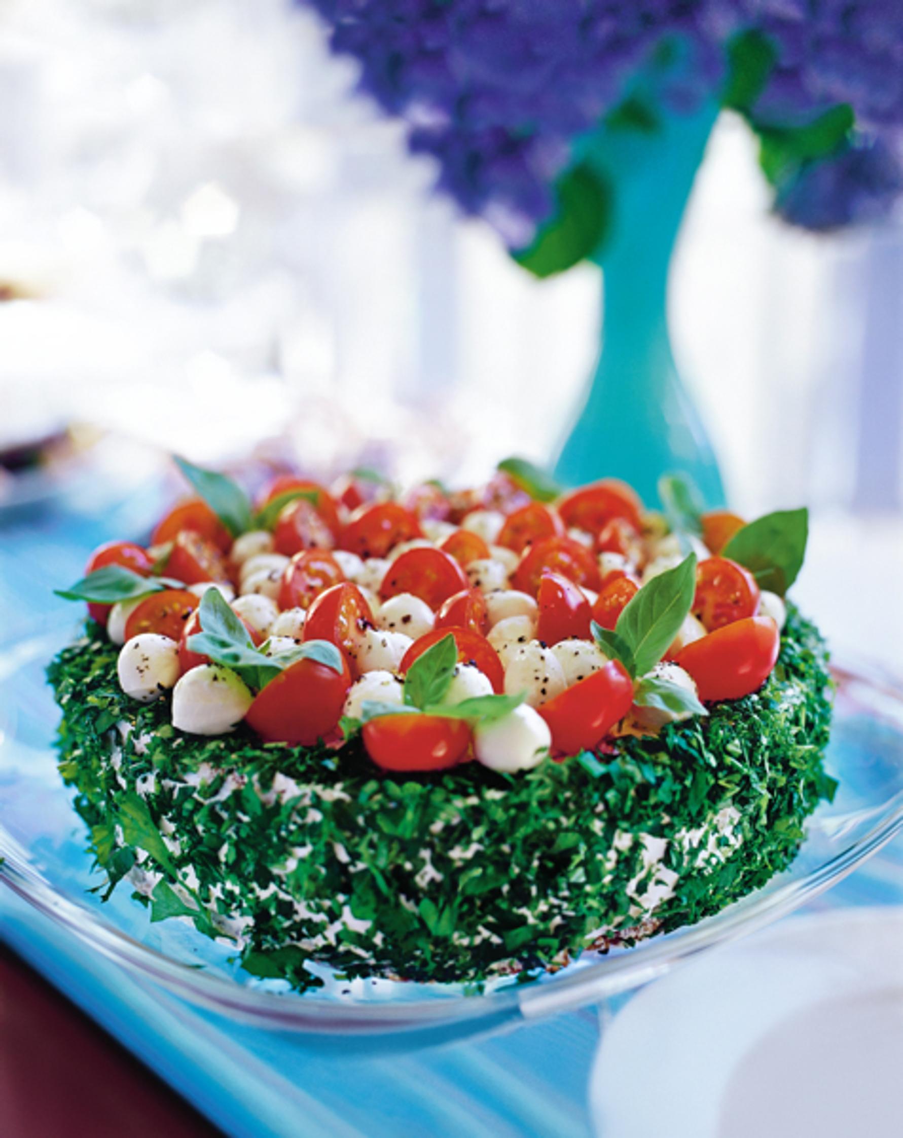 Etsinnässä ihana kasvisvoileipäkakku? Kaunis tomaatti-mozzarellakakku on silmänilo ja juhlapöydän mehevin herkku, jossa maistuvat tomaatti, mozzarella ja basilika.