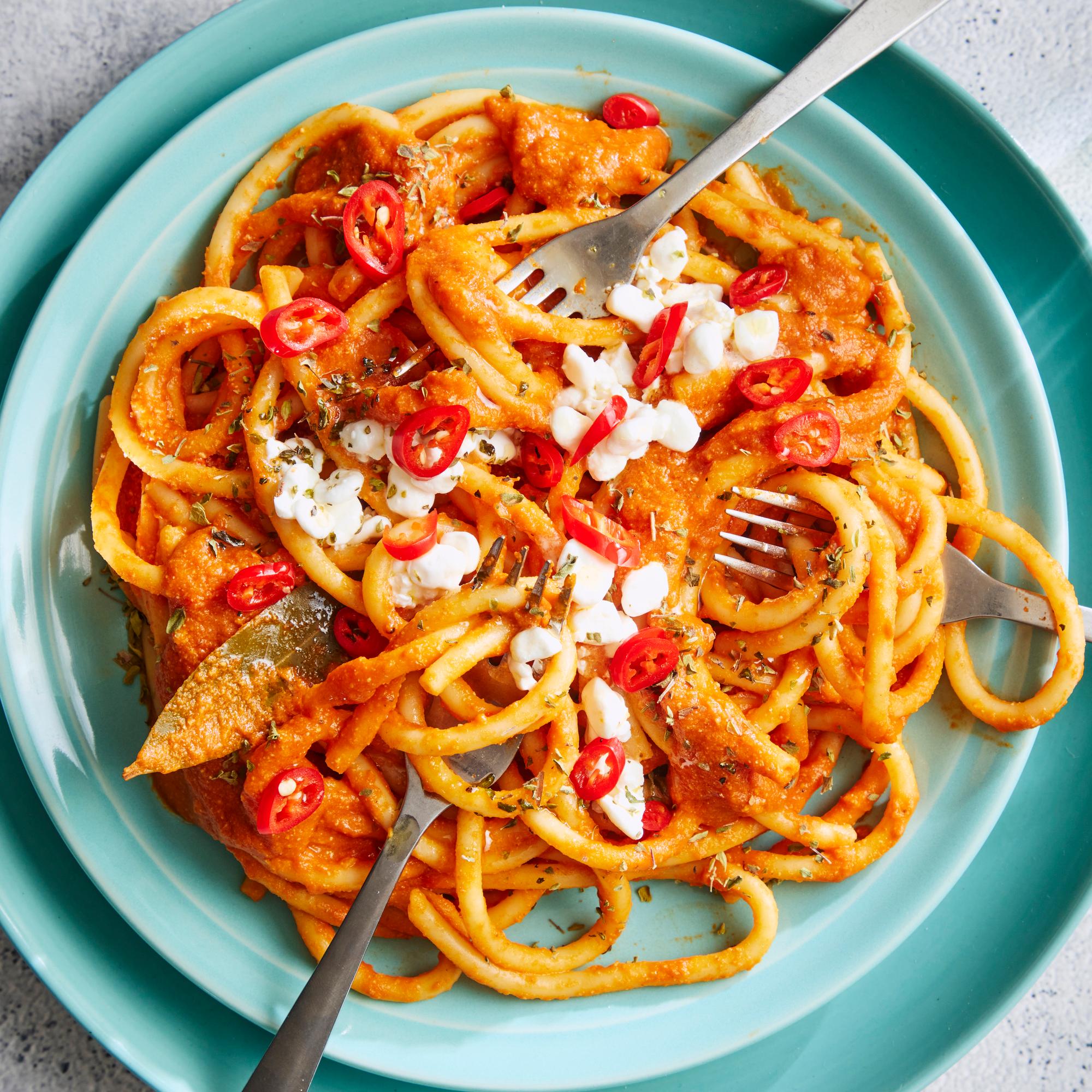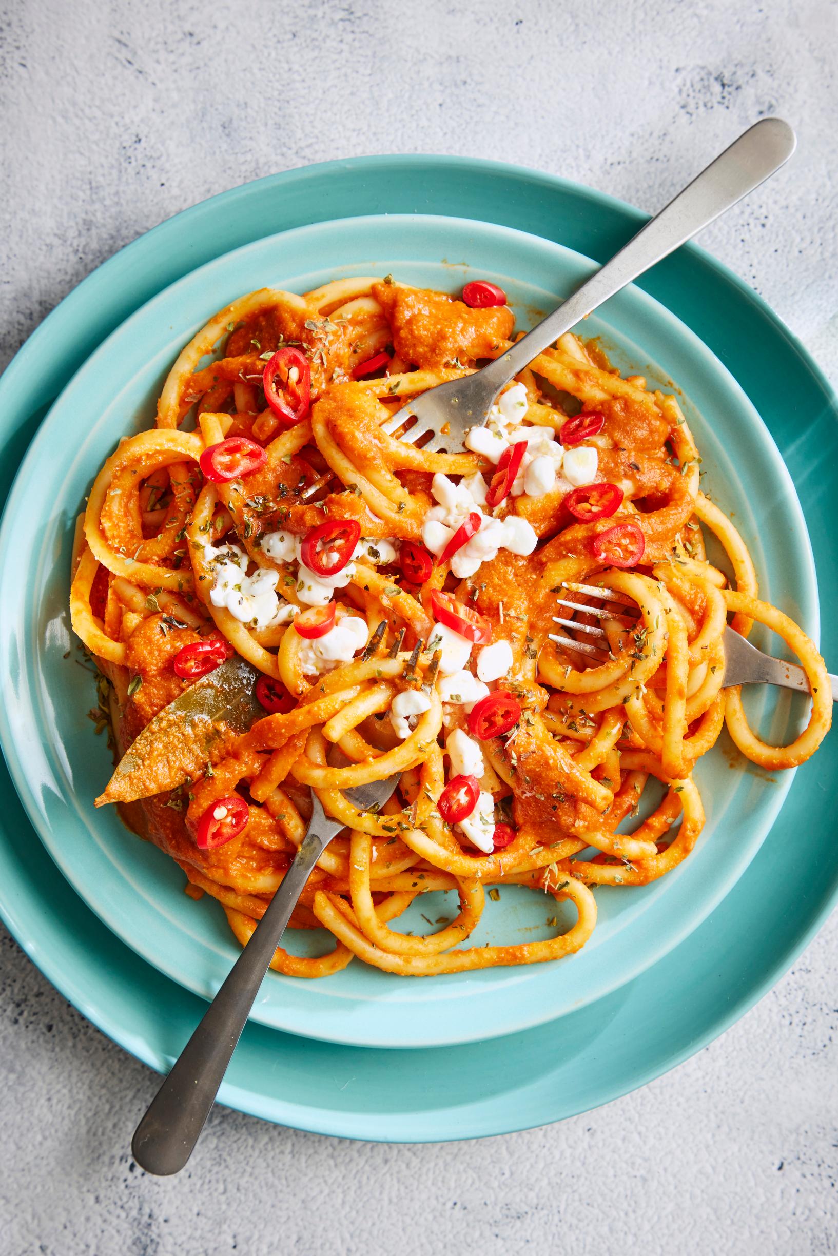 Tomaatti-raejuustopasta – kastikkeeseen surautettu raejuusto tekee ruoasta kermaisen ja proteiinipitoisen