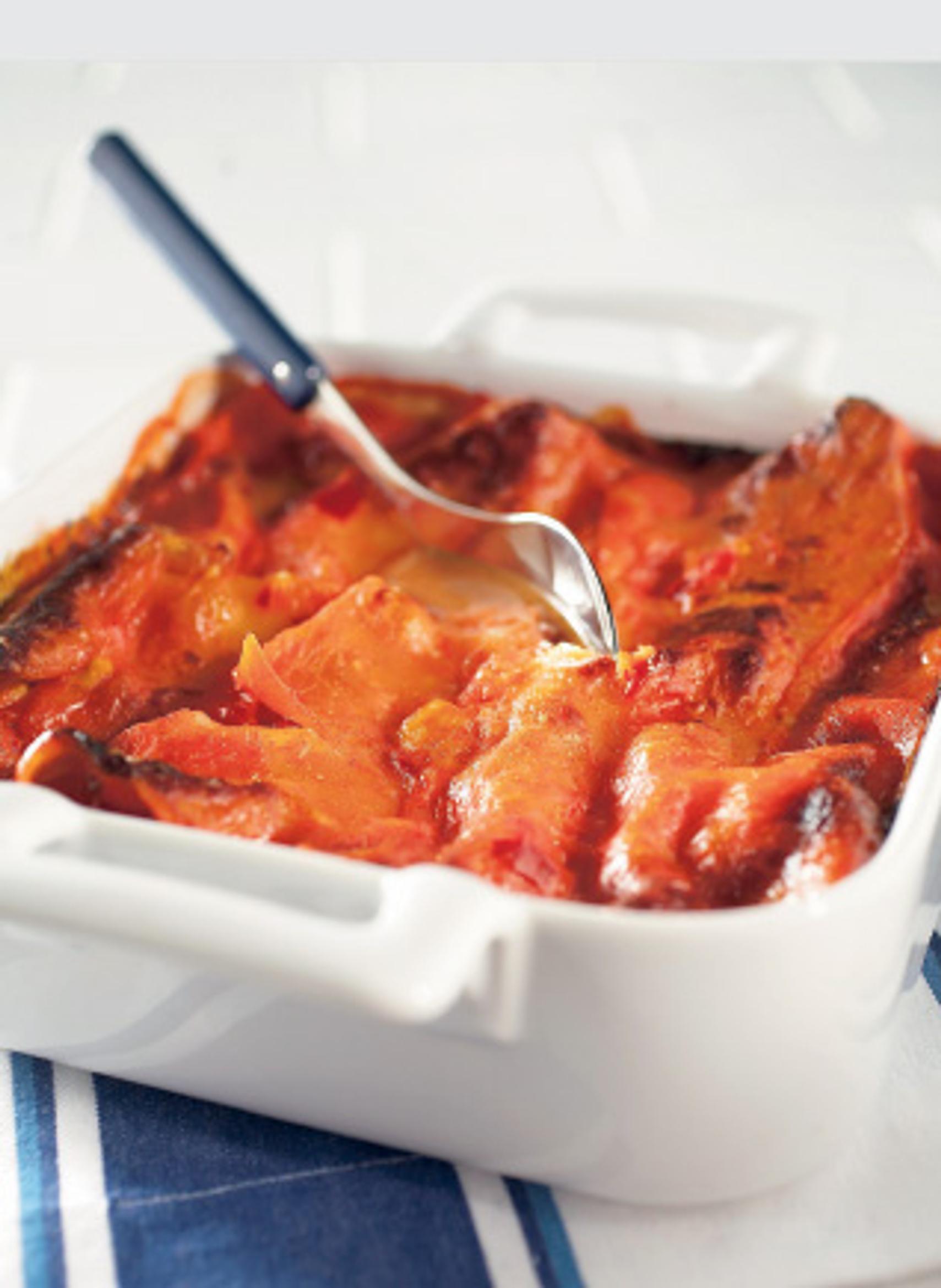 Leikkaa paprika pieniksi paloiksi. Kokoa lasagne kaatamalla ensin öljytyn uunivuoan pohjalle hiukan ranskankermakastiketta ja asettele päälle lasagnelevyjä niin, että pohja peittyy.