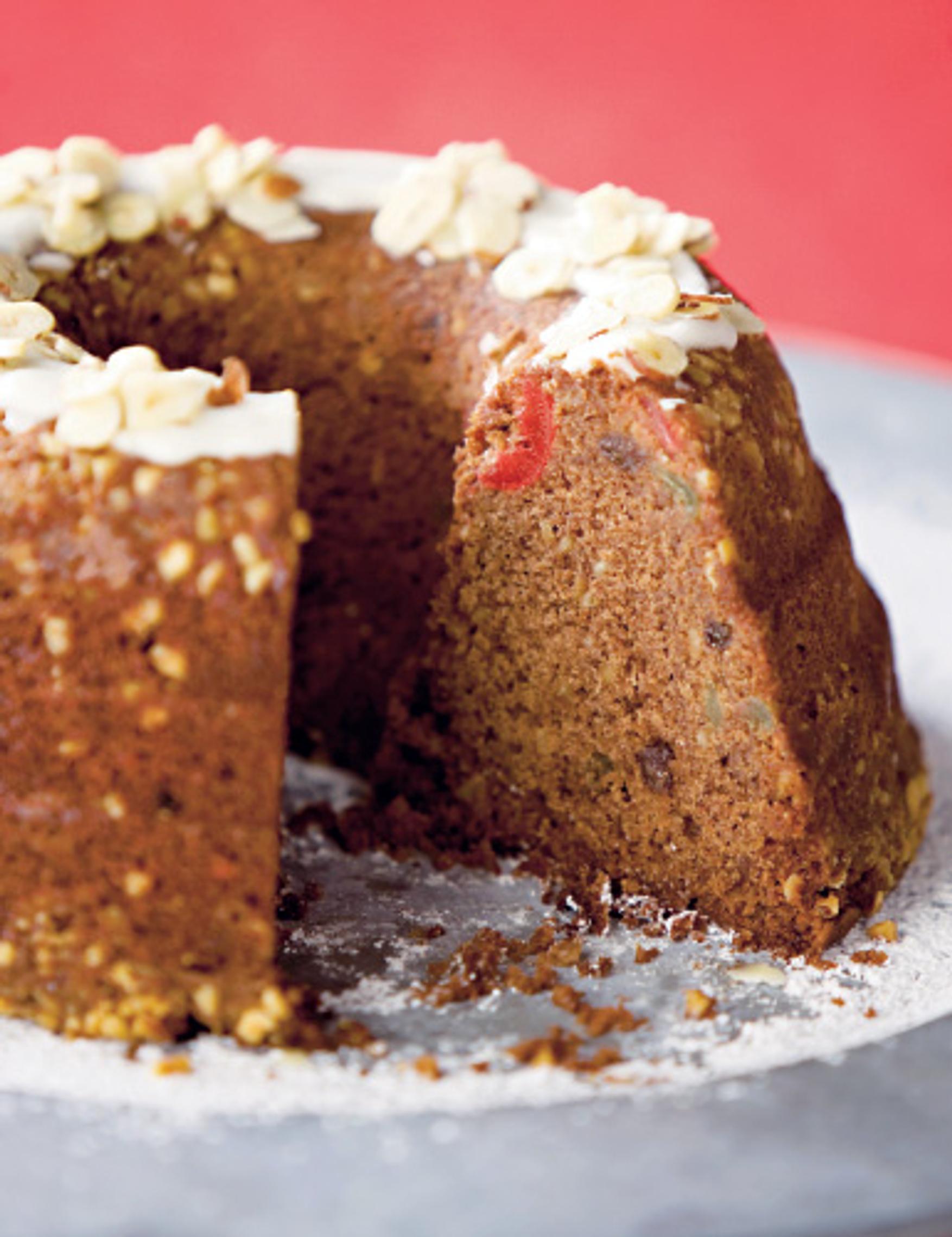 - Koristele perinteinen hedelmäkakku halutessasi konjakkiin sekoitetulla tomusokerilla ja hasselpähkinälastuilla.