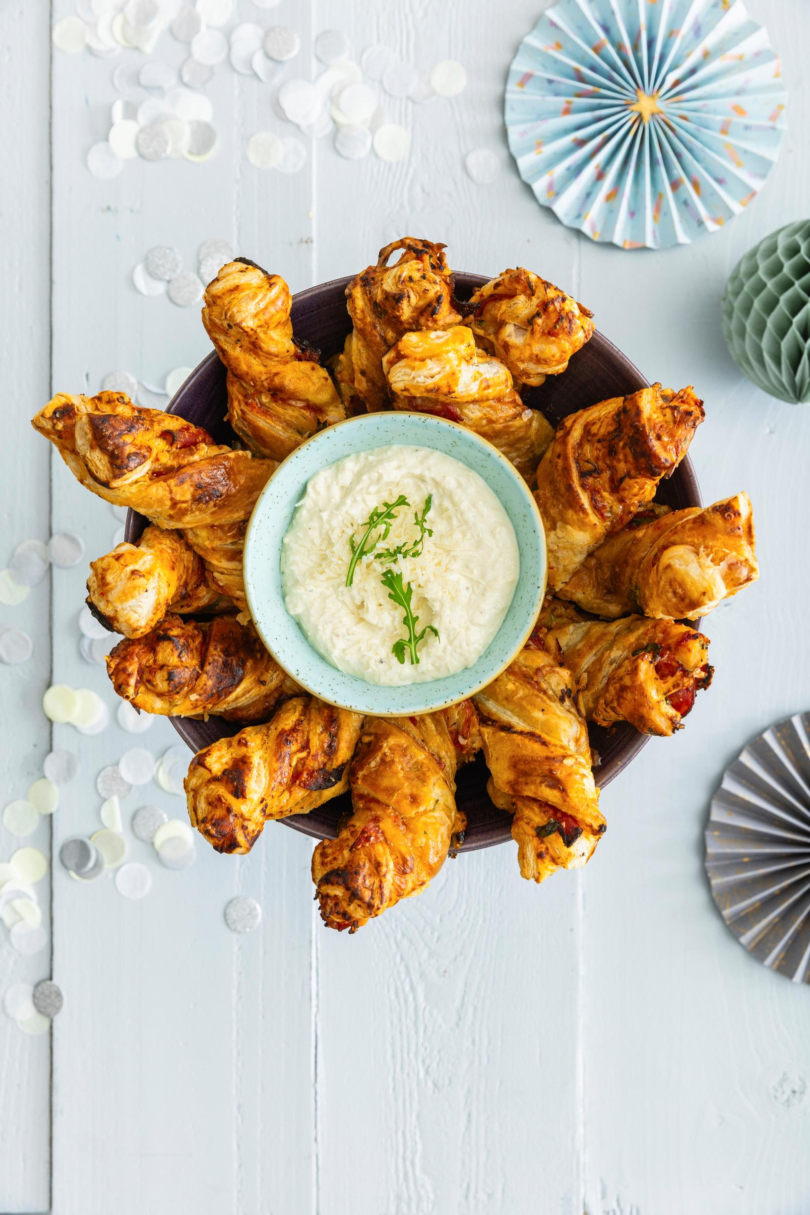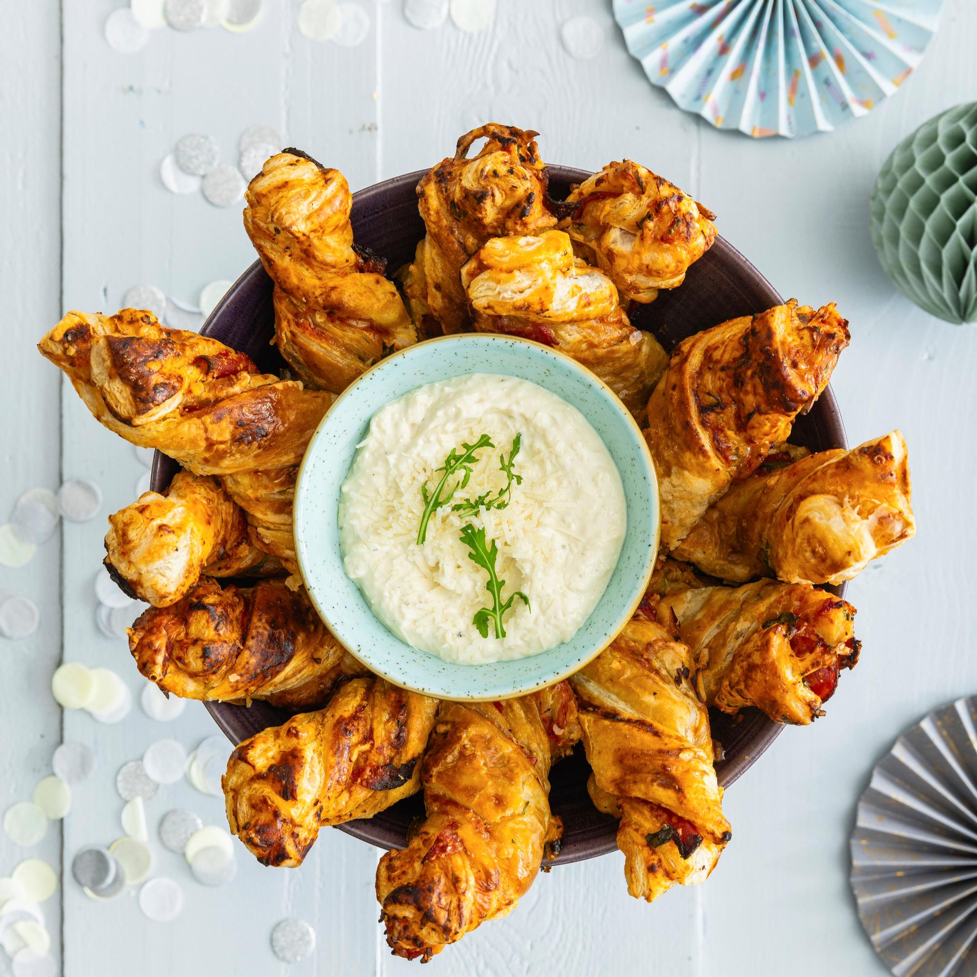 Helpot tuplapizzakierteet syntyvät valmiista lehtitaikinasta – dippaa kermaiseen parmesaanidippiin!