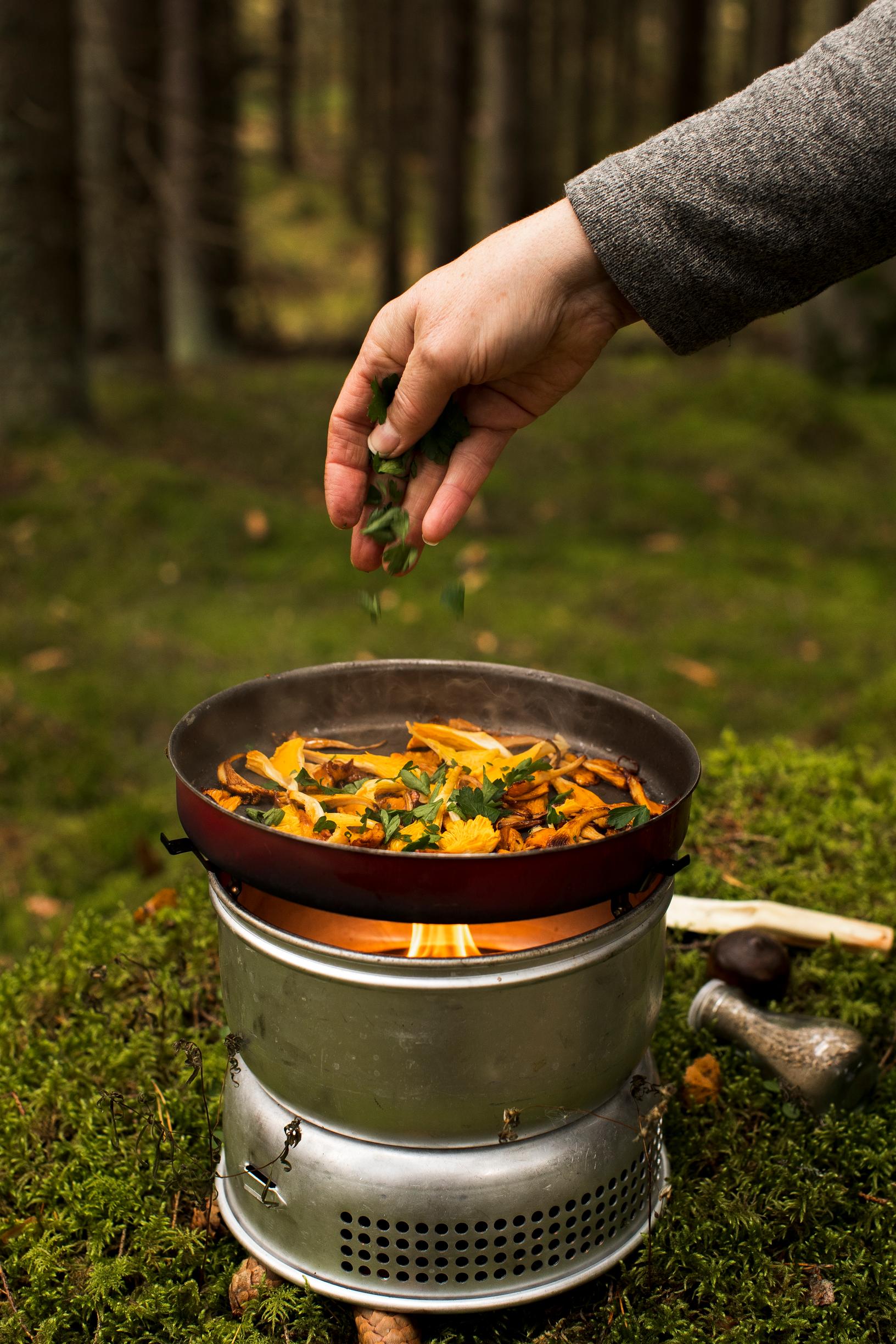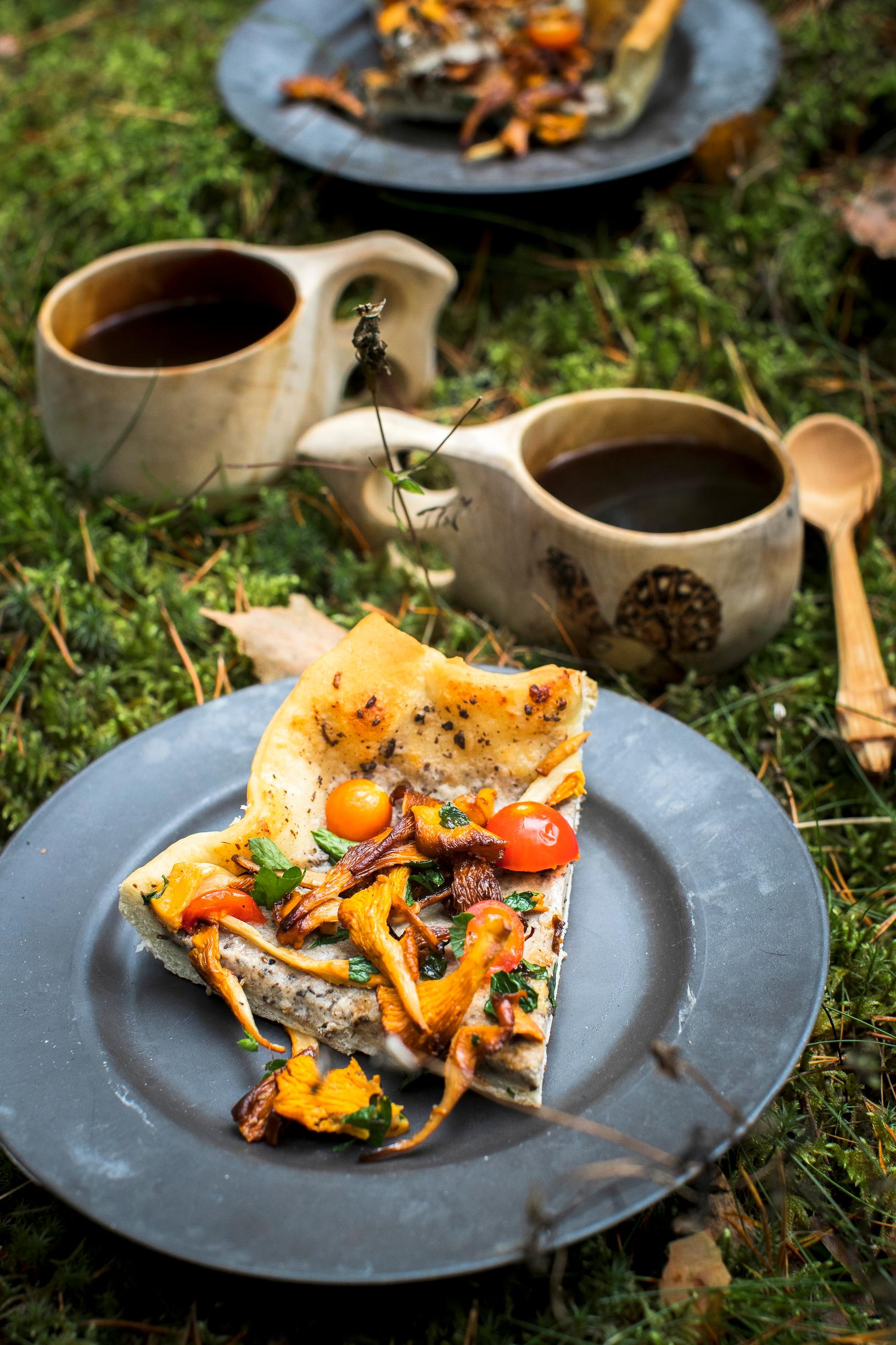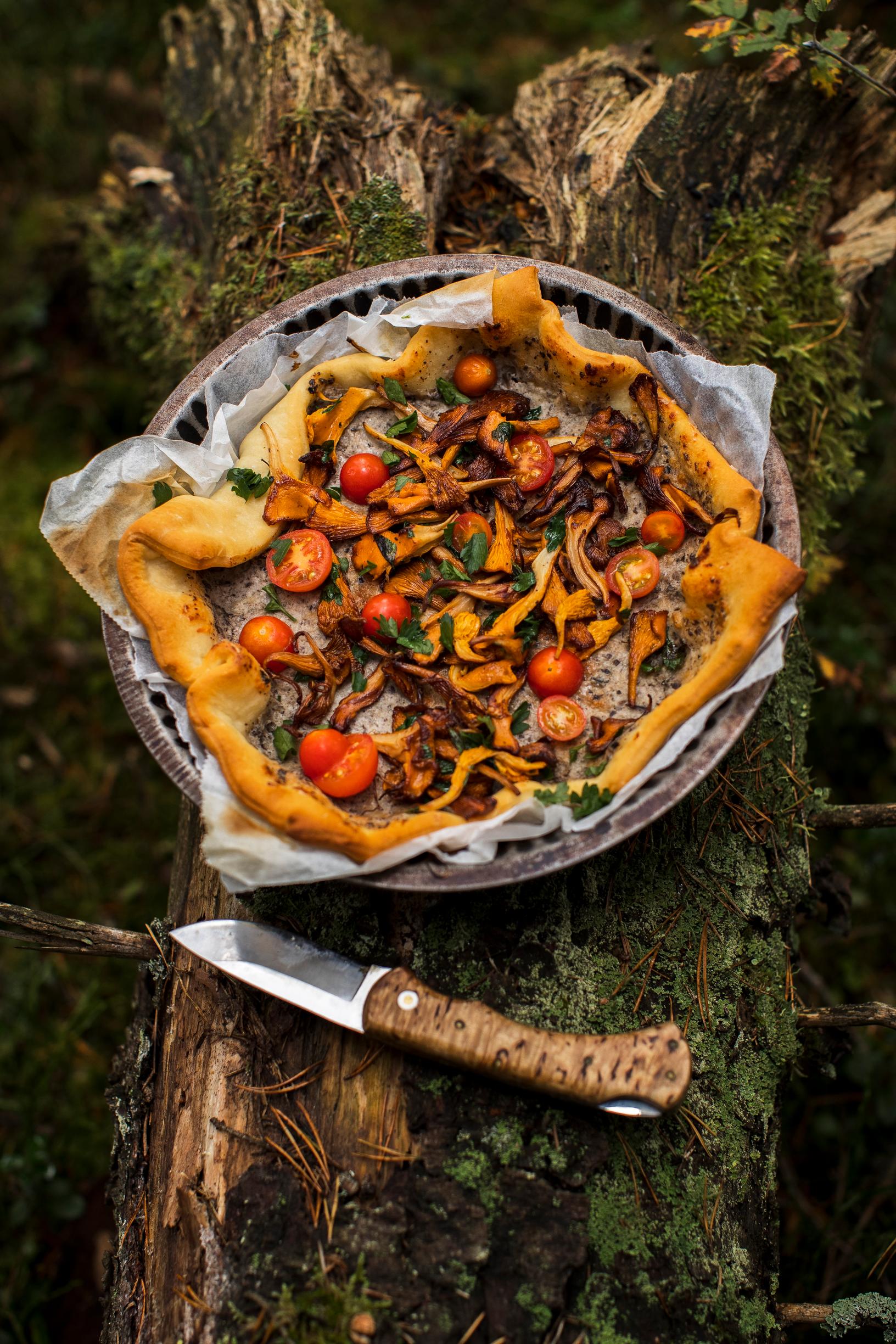 - Kuumenna öljy retkikeittimen pannulla. Revi kantarellit suikaleiksi ja paista sieniä käännellen muutama minuutti. Mausta suolalla ja yrteillä. Kumoa sienet ja tomaatinpuolikkaat piirakan päälle ja nauti sieniretken eväänä.