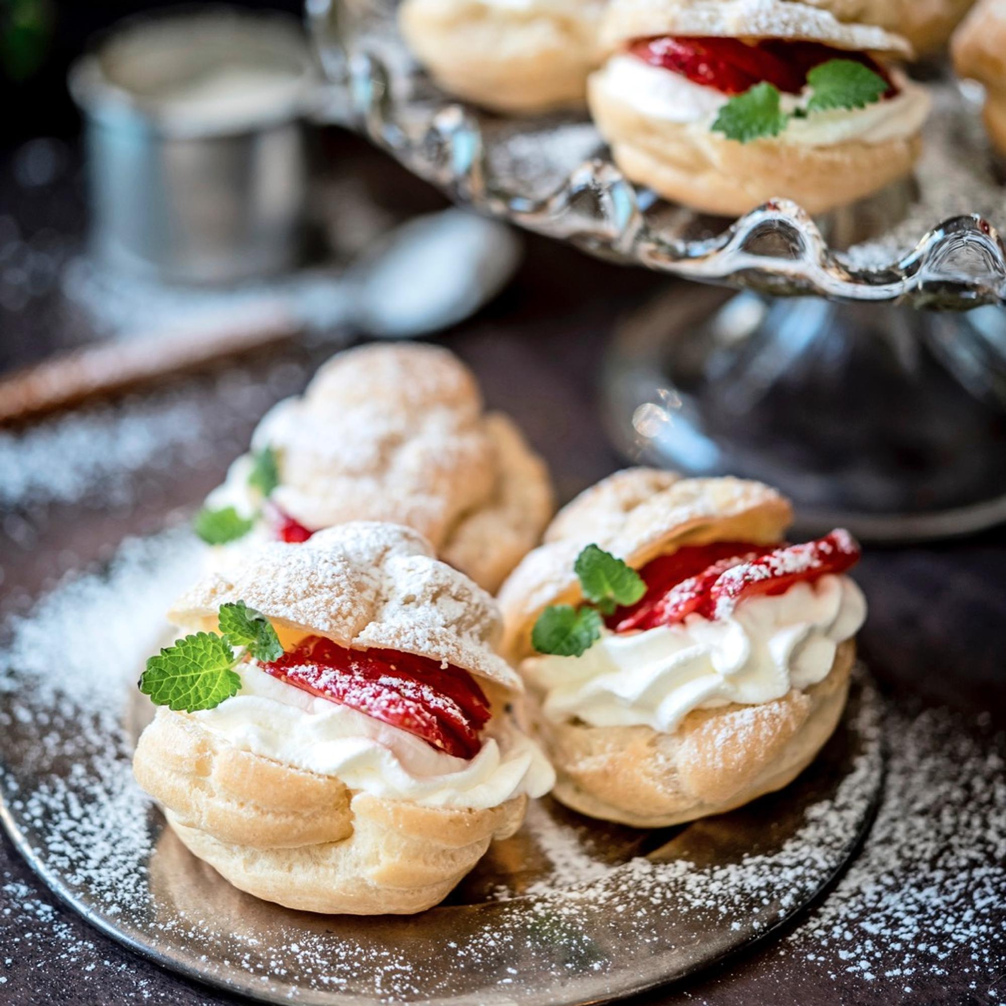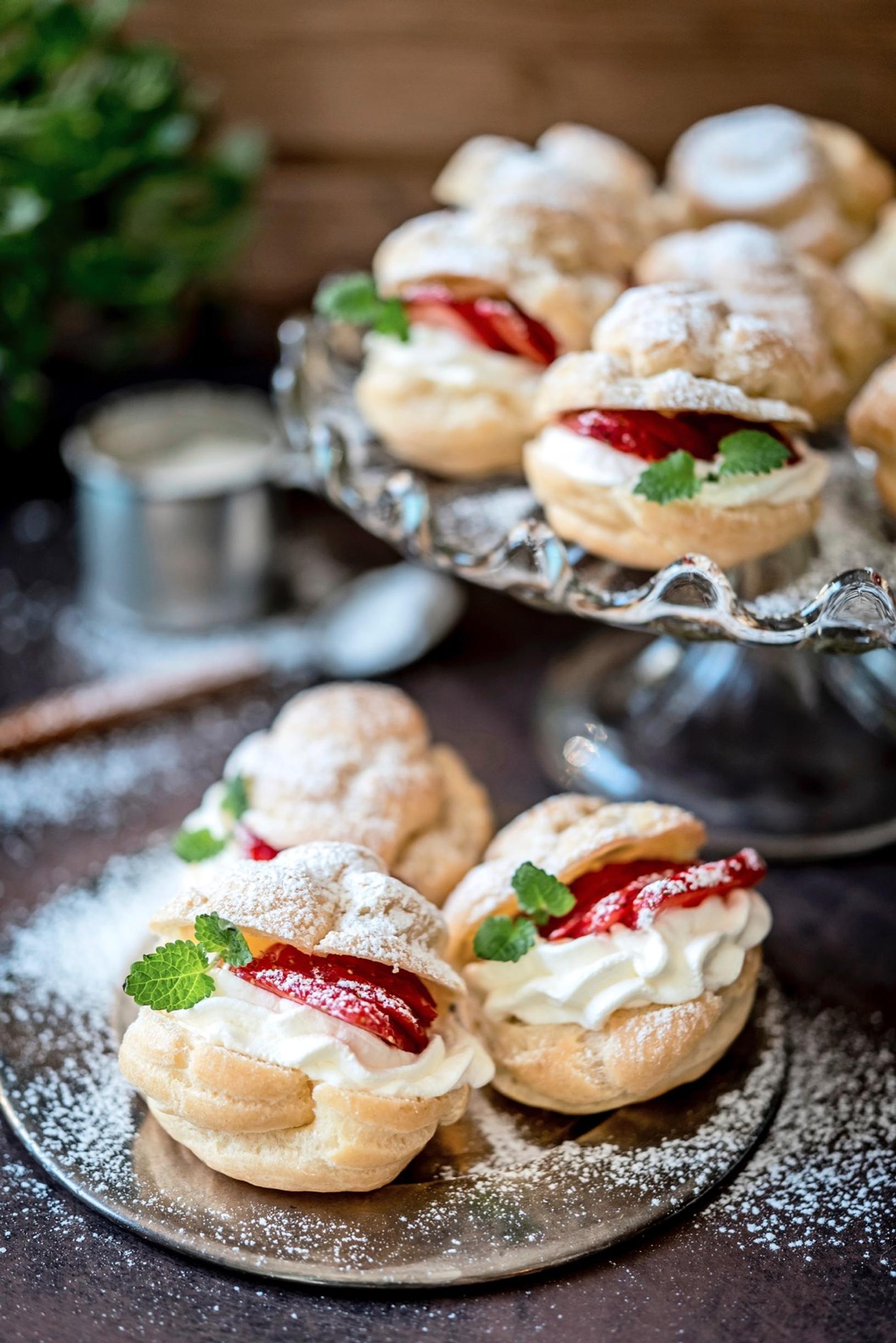 - Täytä tuulihatut kermavaahdolla ja viipaloiduilla tuoreilla mansikoilla juuri ennen tarjoilua. Siivilöi pinnalle halutessasi tomusokeria.