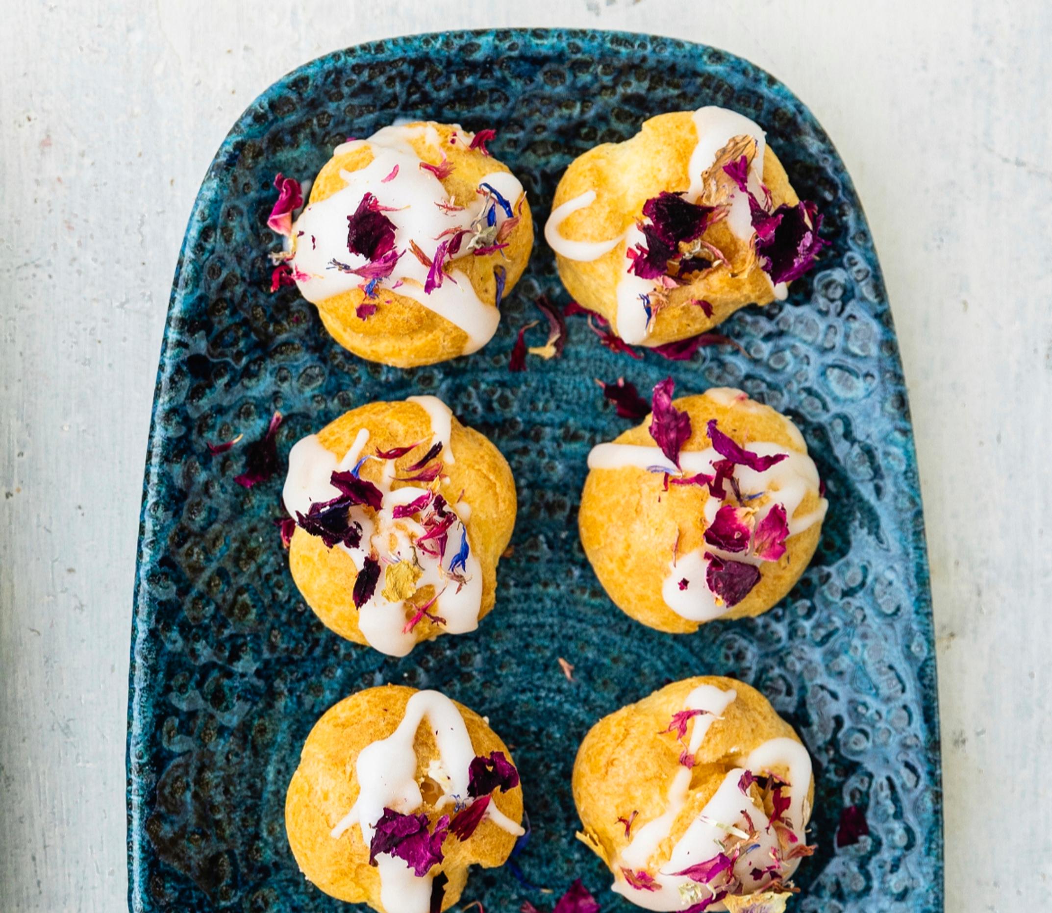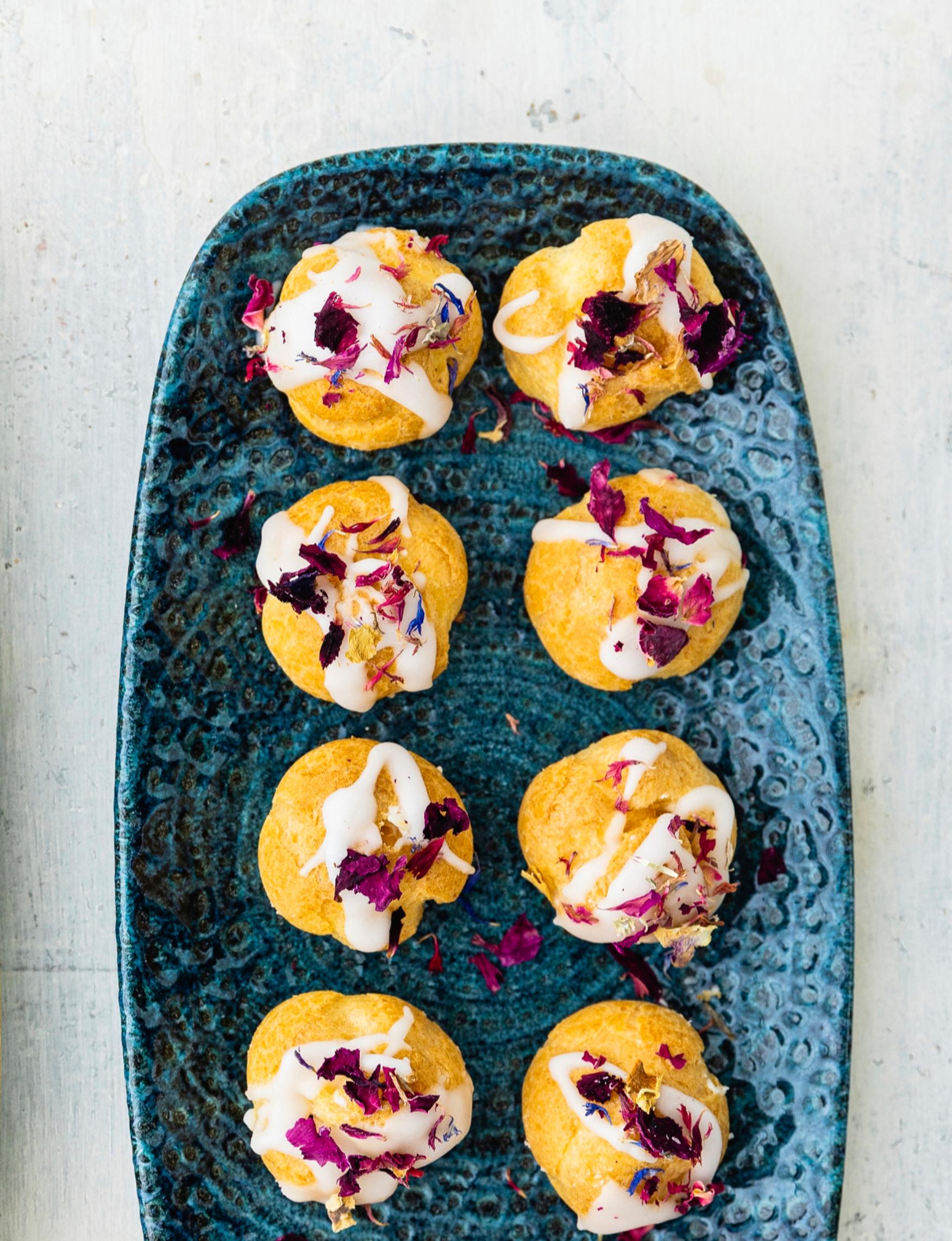 - Valuta kuorrutusta tuulihattujen päälle ja koristele kuivatuilla kukilla. Anna jähmettyä ennen tarjoilua. Säilytä jääkaapissa peitettynä.