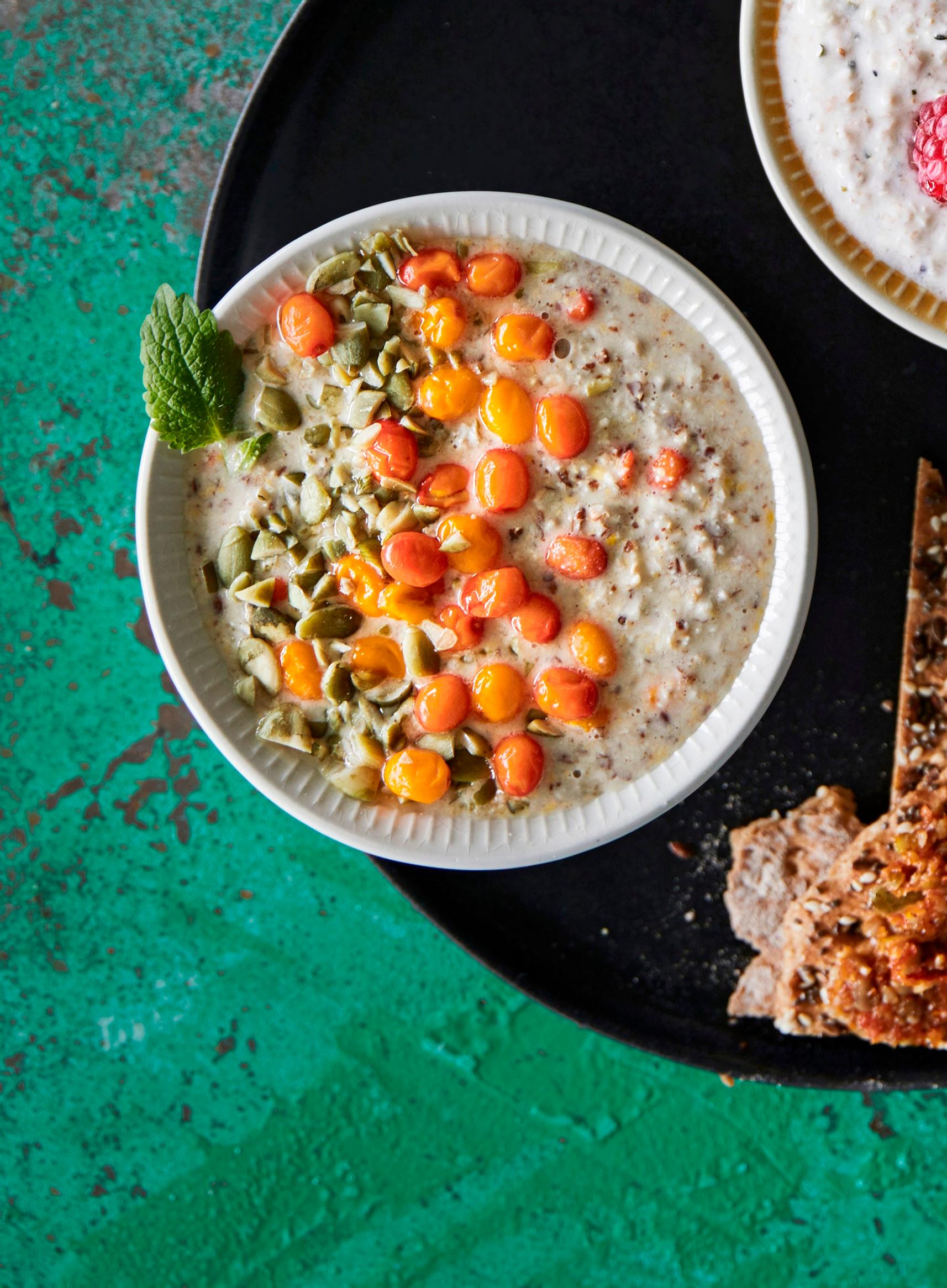 - Laita tuorepuuro kannelliseen astiaan jääkaappiin tekeytymään yön yli. Jaa puuro annoskulhoihin ja koristele tyrneillä ja auringonkukansiemenillä.