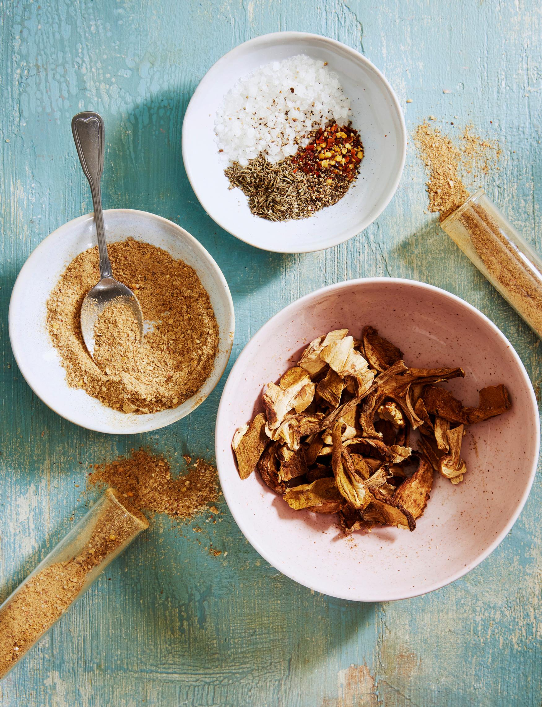 - Aja ainekset pulverimaiseksi jauheeksi. Voit jauhaa sienet ja mausteet mahdollisimman hienoksi myös morttelissa.