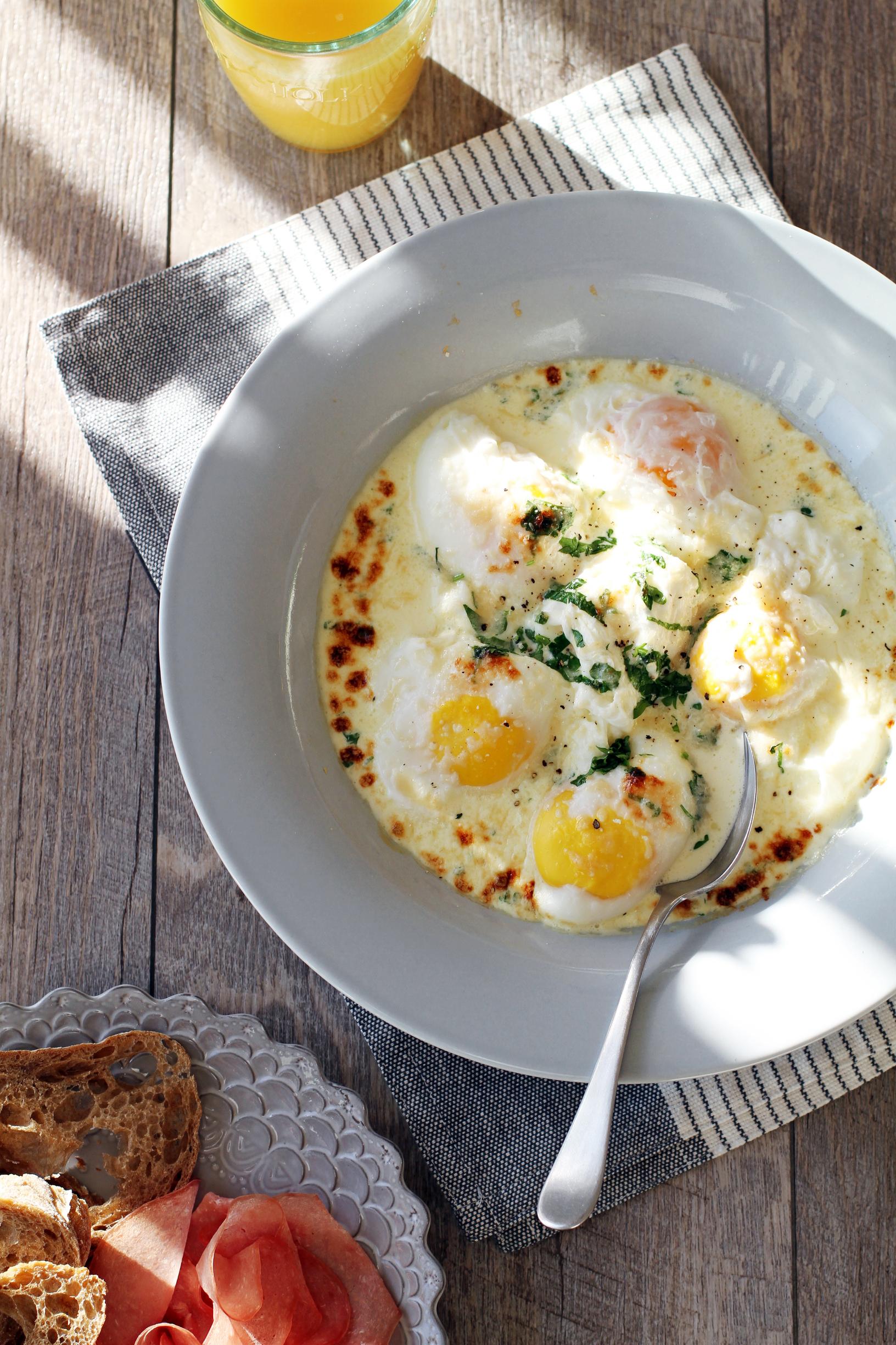 Sekoita kermaan raastettua parmesaania, hienonnettua lehtipersiljaa, suolaa ja pippuria. Kaada seos uppomunien päälle. Raasta pinnalle vielä ekstraparmesaania. Laita vuoka uuniin grillivastuksen alle 3-4 minuutiksi kunnes pinta kuplii ja reunat saavat väriä.