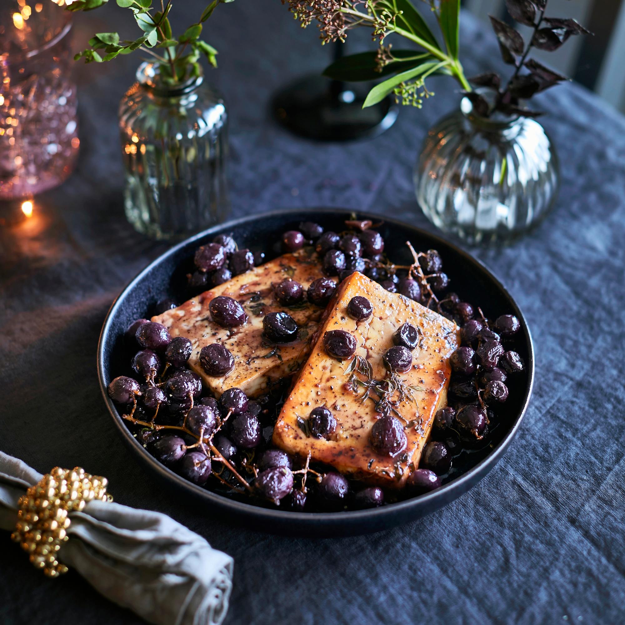Uunifeta ja makeat viinirypäleet paahtuvat kätevästi samalla pellillä. Tarjoa trendikäs uunifeta pikkusyötävänä tai leivän kanssa.