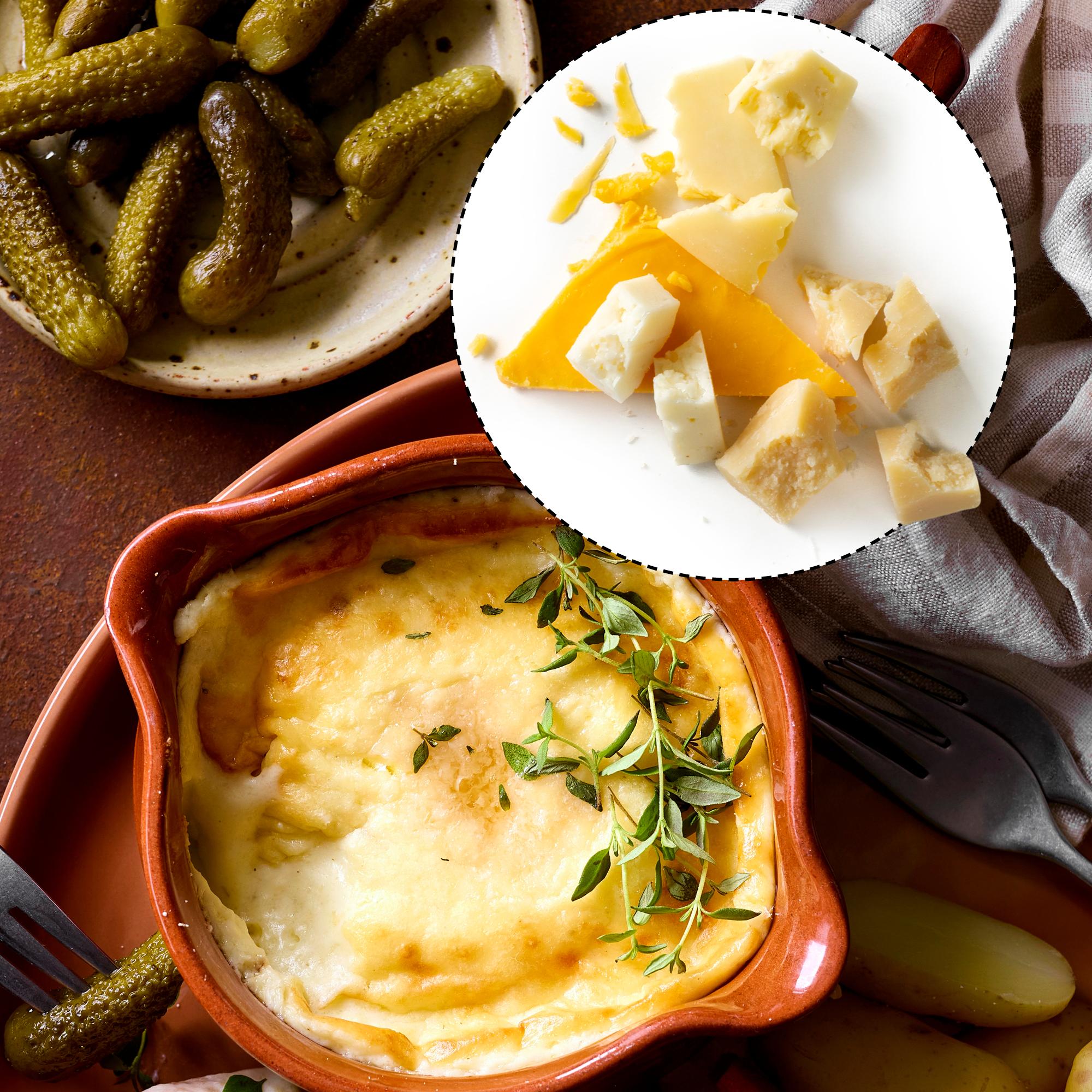 Mausteyrttien kanssa ei ole myöskään niin justiinsa. Timjamin voi korvata rosmariinilla, basilikalla, persiljalla tai korianterilla. Jos tuoreyrttejä ei ole tarjolla, käytä kuivattuja. Hyödynnä uunifondueen myös jääkaapin perukoilla lymyävien säilyketölkkien liemiä. Tilkka suolakurkkujen, jalapenojen tai hillosipuleiden lientä antaa fondueen pikantin makulisän. Jouluttaja lorauttaa joukkoon tilkan punajuurilientä.
