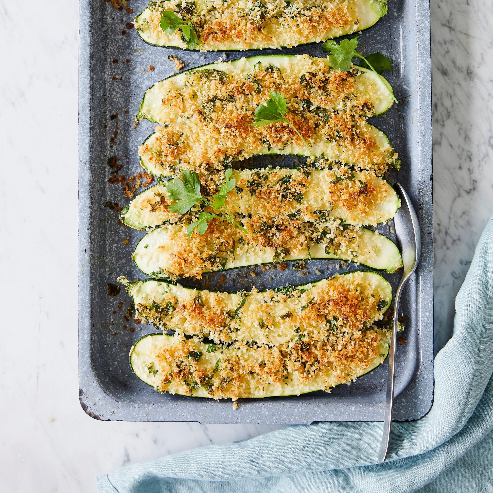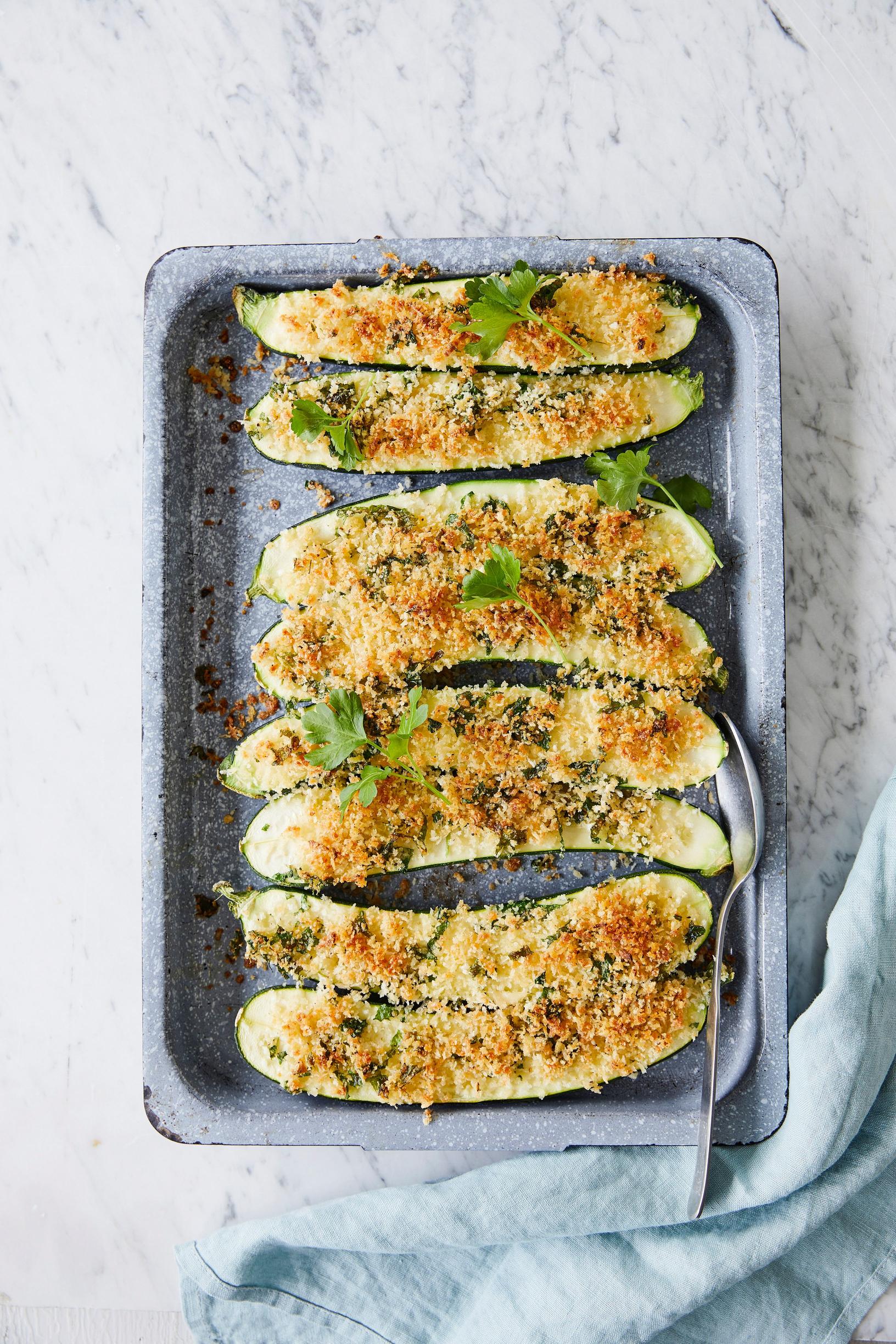 Kesäkurpitsat valmistuvat uunissa ihanan rapeiksi, kun niiden pinnalle ripottelee parmesaani-pankomurua. Parmesaanin tilalla voit käyttää mitä tahansa voimakasta juustoa, kuten pecorinoa, grana padanoa, appenzelleriä tai gruyèreä.