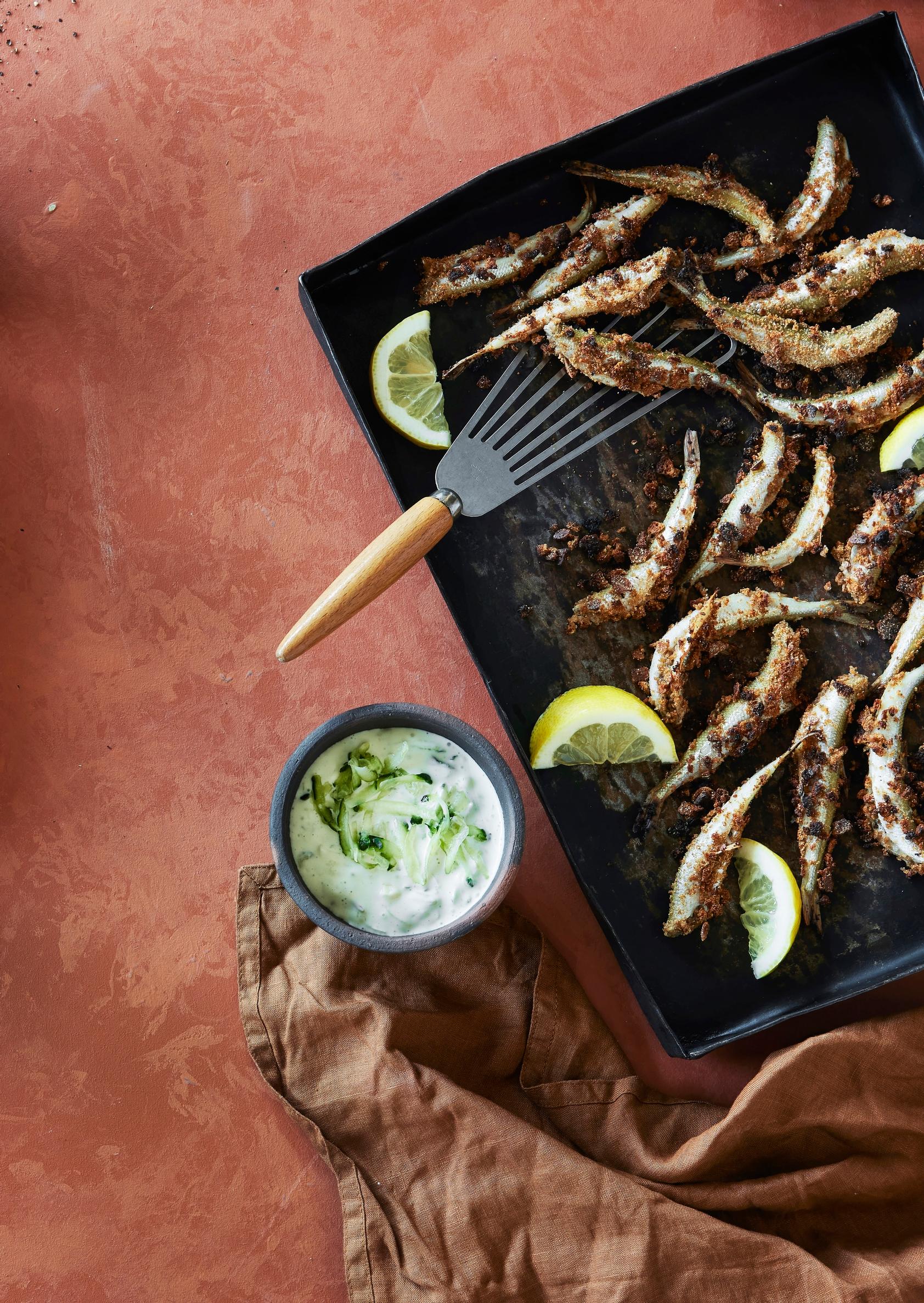 - Sekoita kaloihin sitruunanmehu ja suola. Murskaa hapankorput hienoksi. Sekoita sitruunasta raastettu kuori joukkoon. Pyörittele kalat hapankorppumurussa.