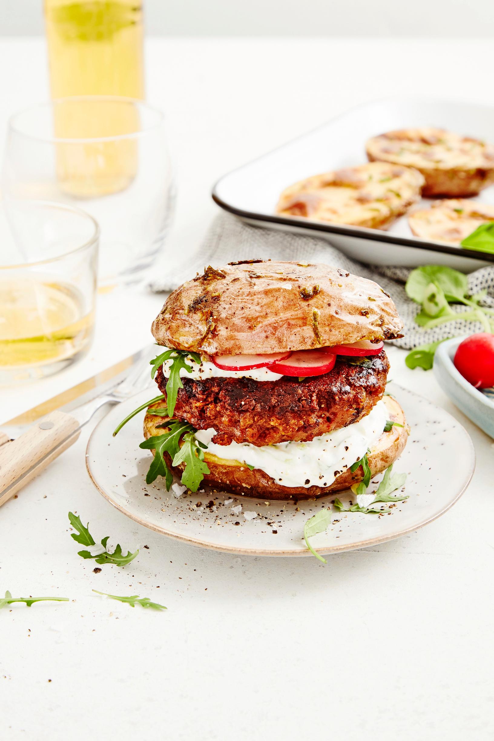 Uuniperunaburgeri on hampurilaisen uusi, hauska ja ruokaisa muoto. Korvaa sämpylät isoilla uuniperunoilla, paista väliin maukas kasvispihvi ja sekoita tsatsiki kastikkeeksi. Rapsakkaa lisämakua tuovat retiisiviipaleet.
