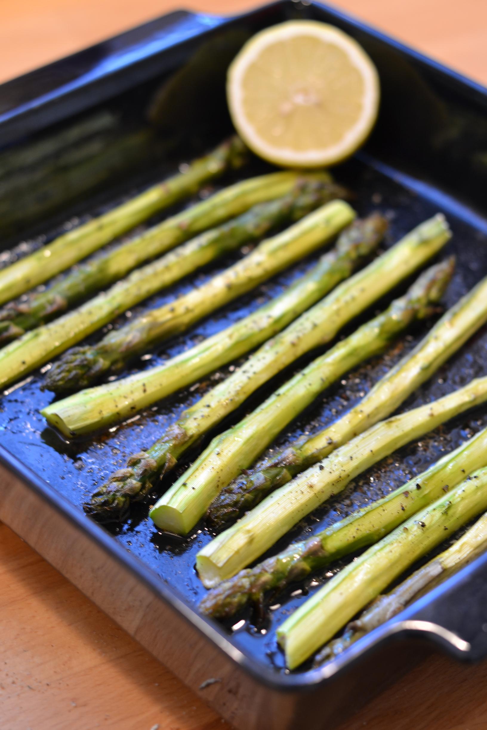 - Pirskota sitruunamehu parsojen pinnalle ja pyöräytä parsoja varovasti uunivuoassa voi-sitruunakastikkeessa.
