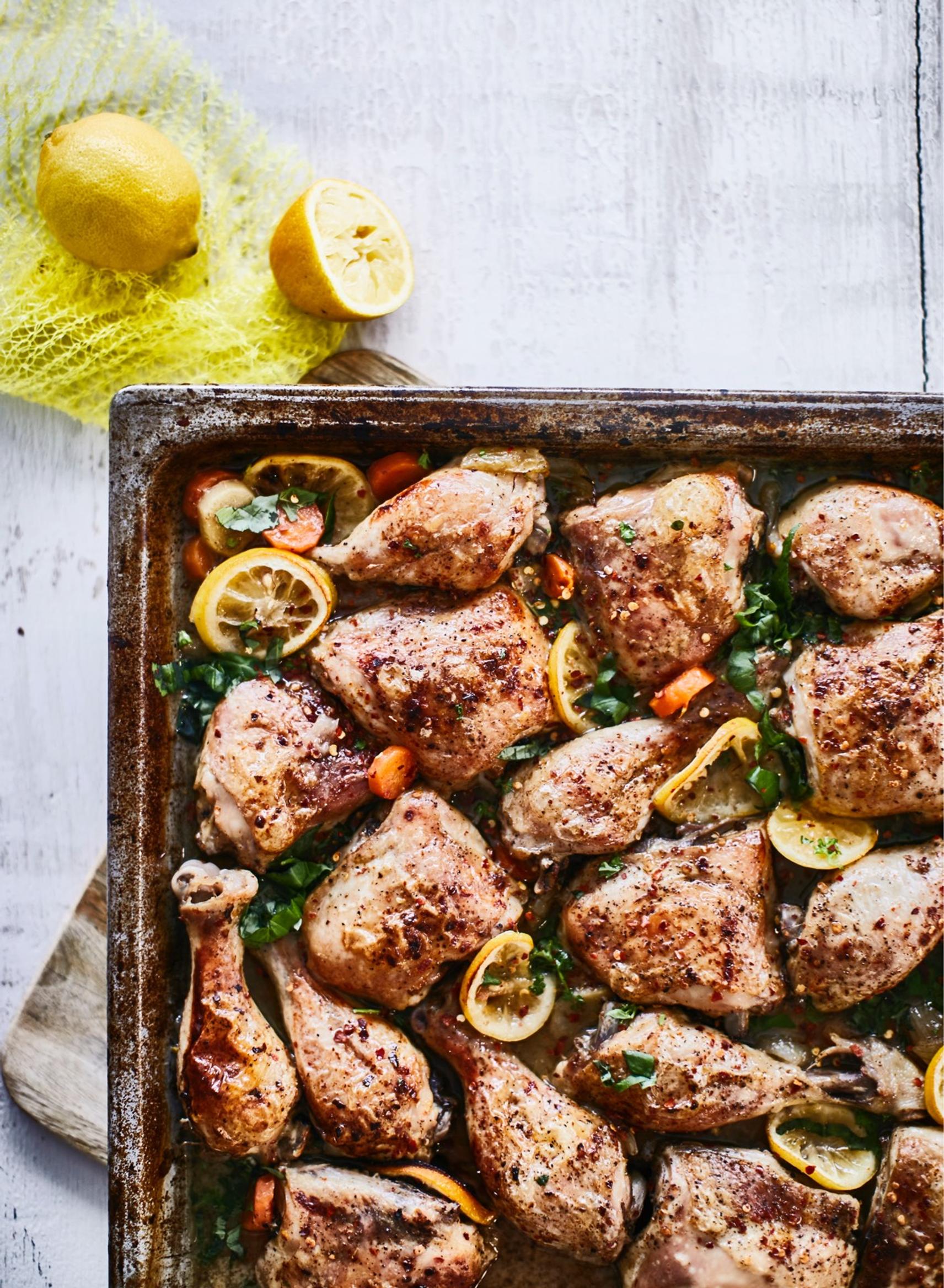 - Kuori ja paloittele porkkanat ja sipulit. Kuori ja raasta inkivääri, viipaloi sellerinvarret. Pane kasvikset reunalliselle uunipellille. Nosta koipireidet kasvisten päälle. Mausta suolalla, pippurilla ja chilillä. Viipaloi sitruuna ja asettele viipaleet broilerien päälle.