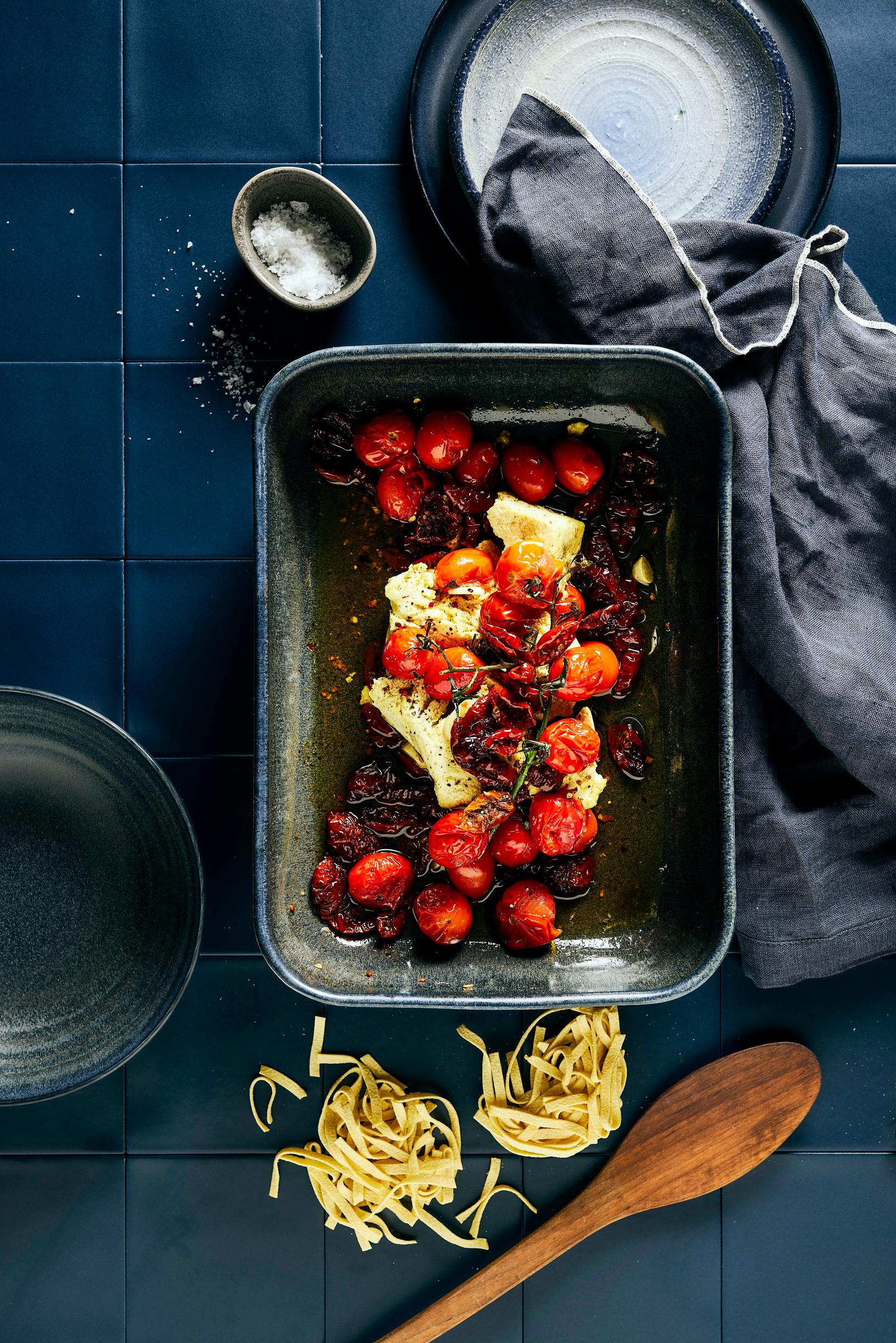 - Huuhtele kirsikkatomaatit ja lisää ne vuokaan. Mausta tofu chilirouheella ja suolalla. Kypsennä 225-asteisessa uunissa keskitasolla 20 minuuttia.