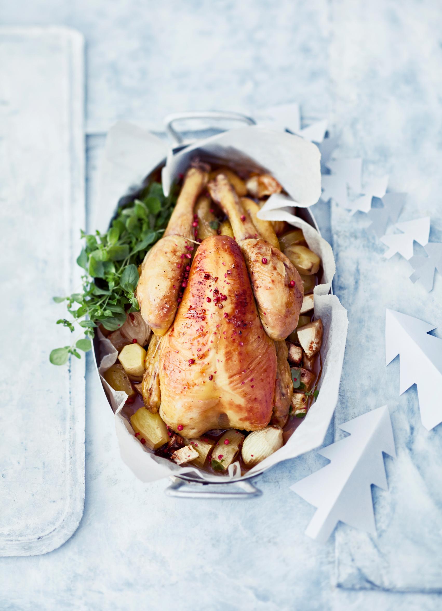 Vaahterasiirapilla maustettu kokonainen kana ja juurekset ovat valmiita uuniin alle puolessa tunnissa. Timjami-kermakastike viimeistelee juhlavan pääruoan.