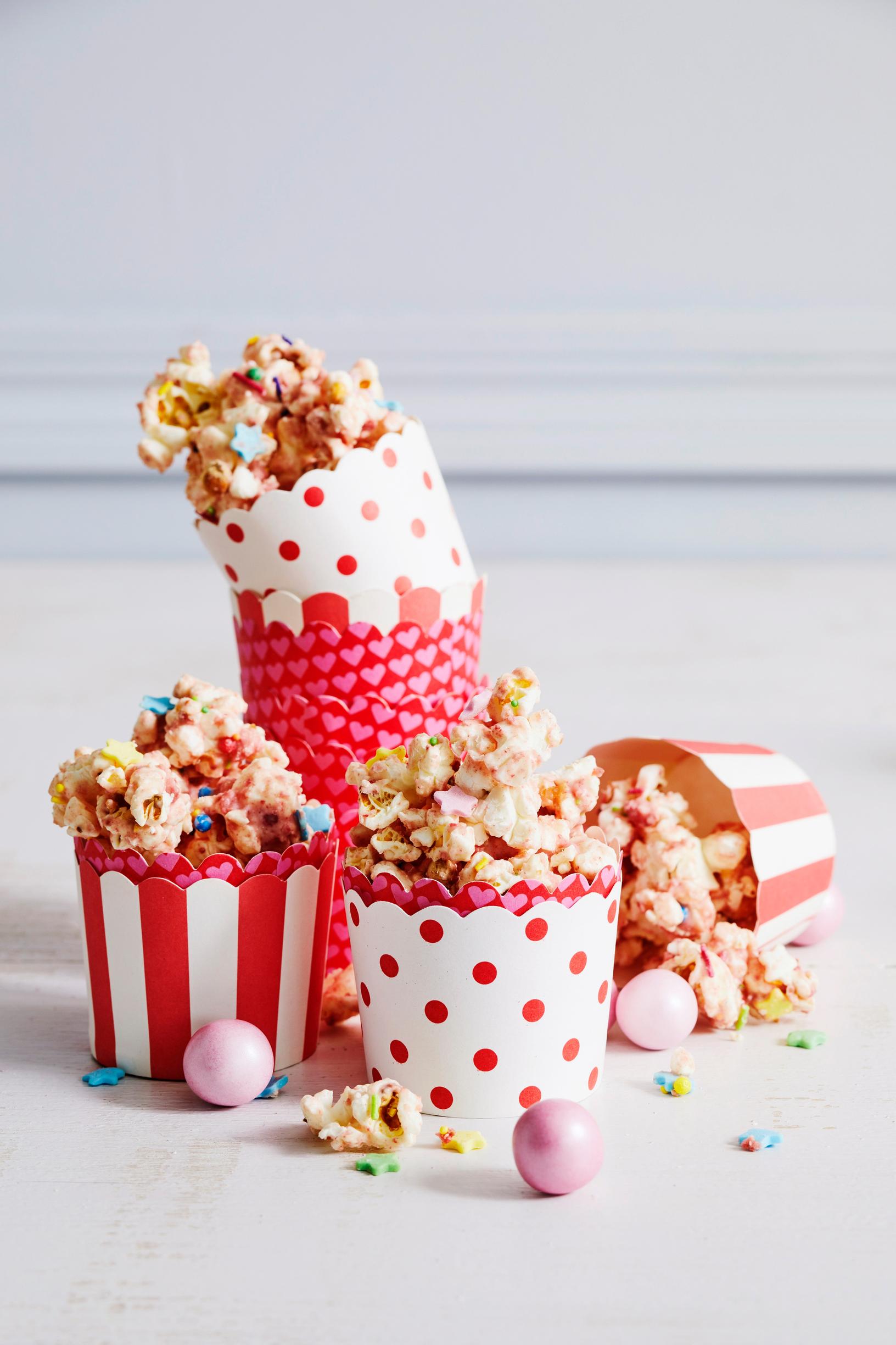 Vaaleanpunainen popcorn yhdistää suolaiset popparit ja mansikkaisen valkosuklaan – varo, näihin jää koukkuun!