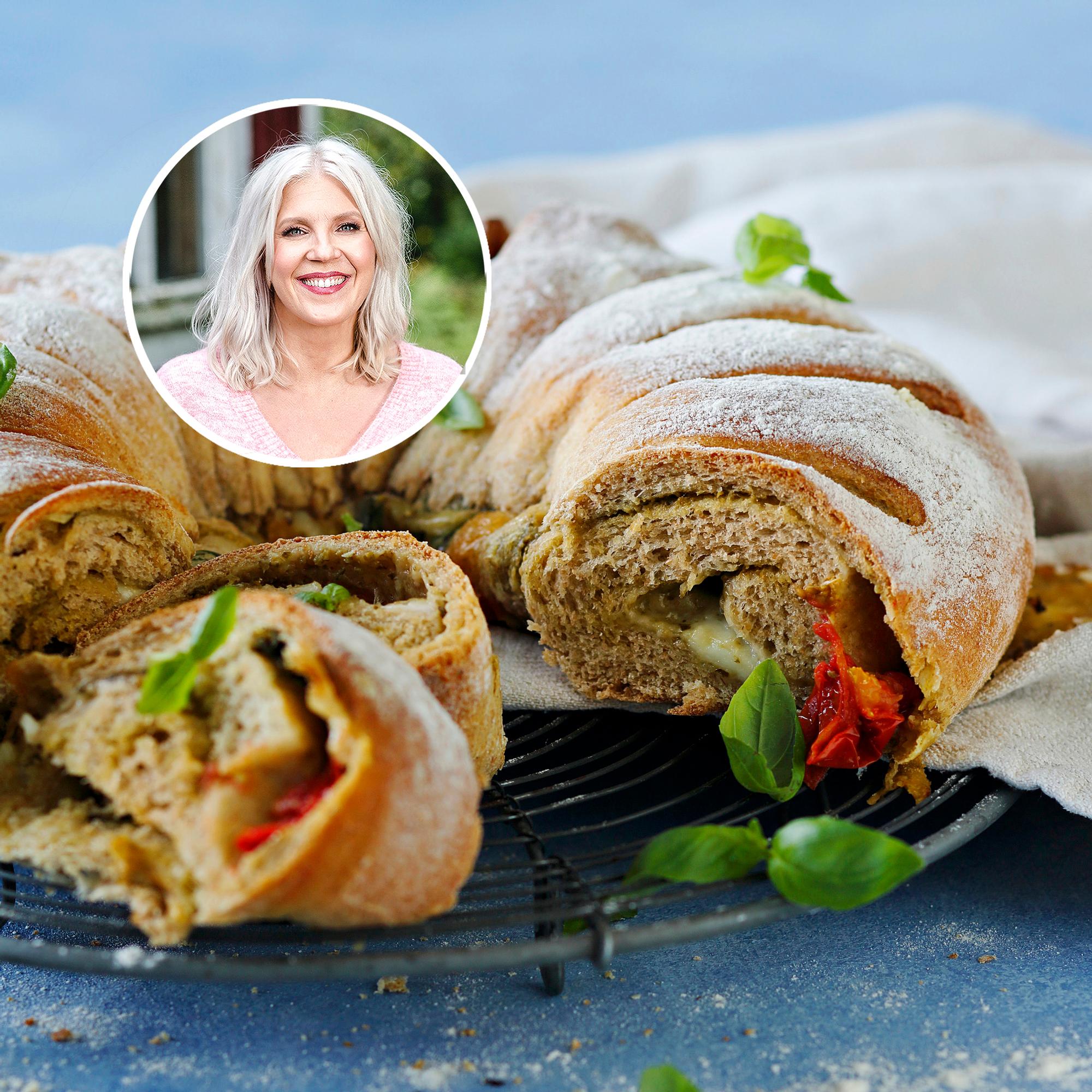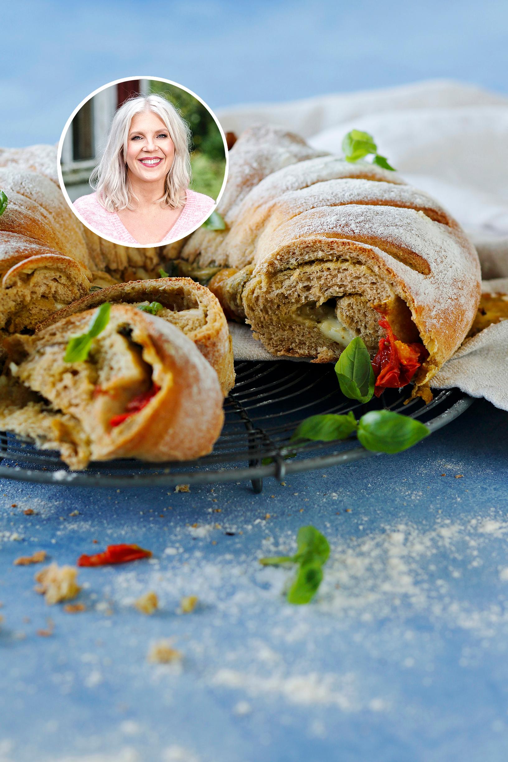 Vappu Pimiän mehevä ja yltäkylläinen Välimeren leipä herauttaa veden kielelle! Pesto, juustot, aurinkokuivatut tomaatit ja basilika piiloutuvat kranssiin ja tekevät leivästä maukkaan. "Välimeren leipä on oman kehittelyni tulos. Tein leipätaikinan ja heitin väliin mitä jääkaapissa oli. Tätä ihanuutta voi muunnella loputtomiin aineksia vaihtamalla", Vappu kertoo reseptistä.