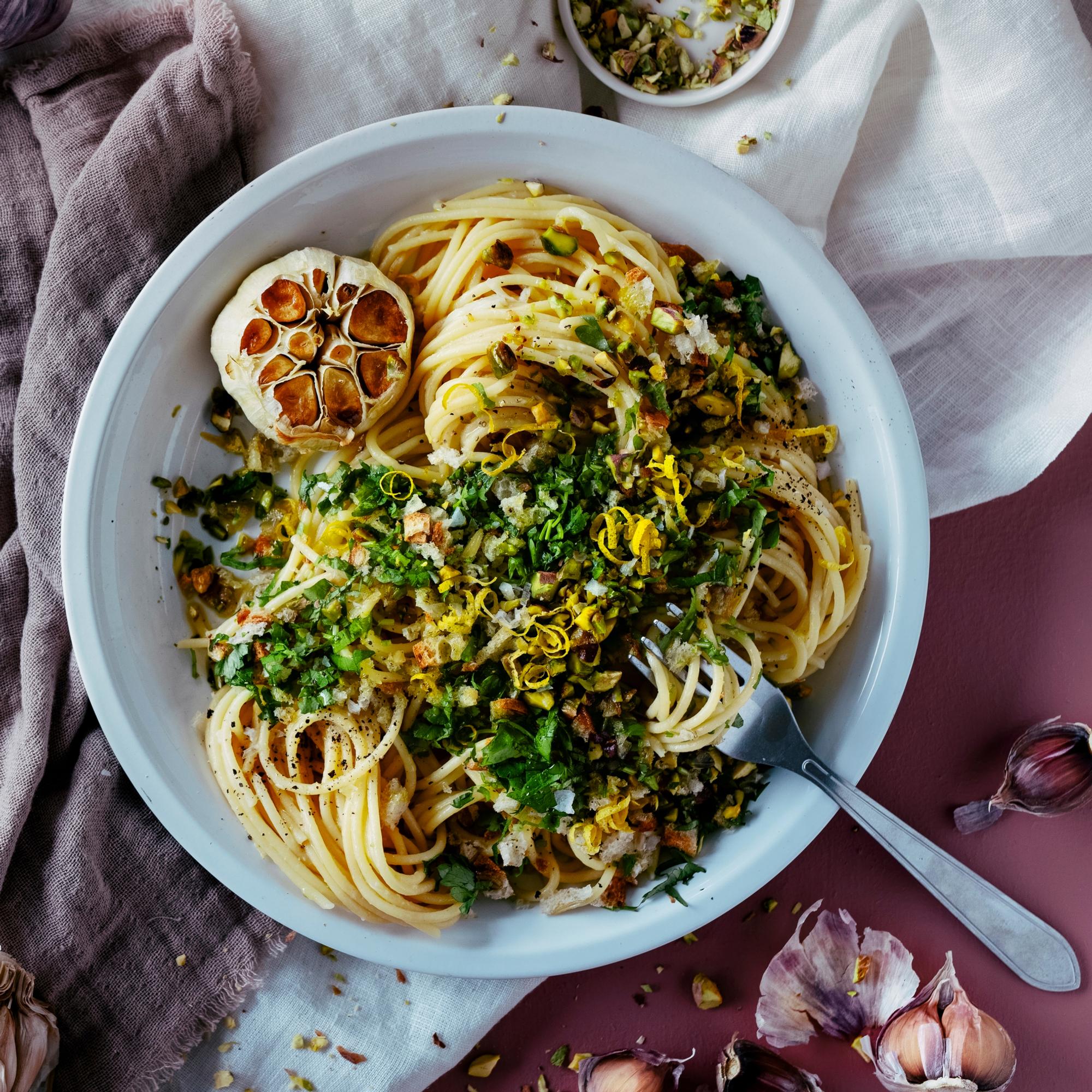 Valkosipulipasta on yksinkertainen mutta ylellisen tuntuinen arkiruoka. Rouhea pistaasi-leipäripote viimeistelee makuja pursuvan annoksen.