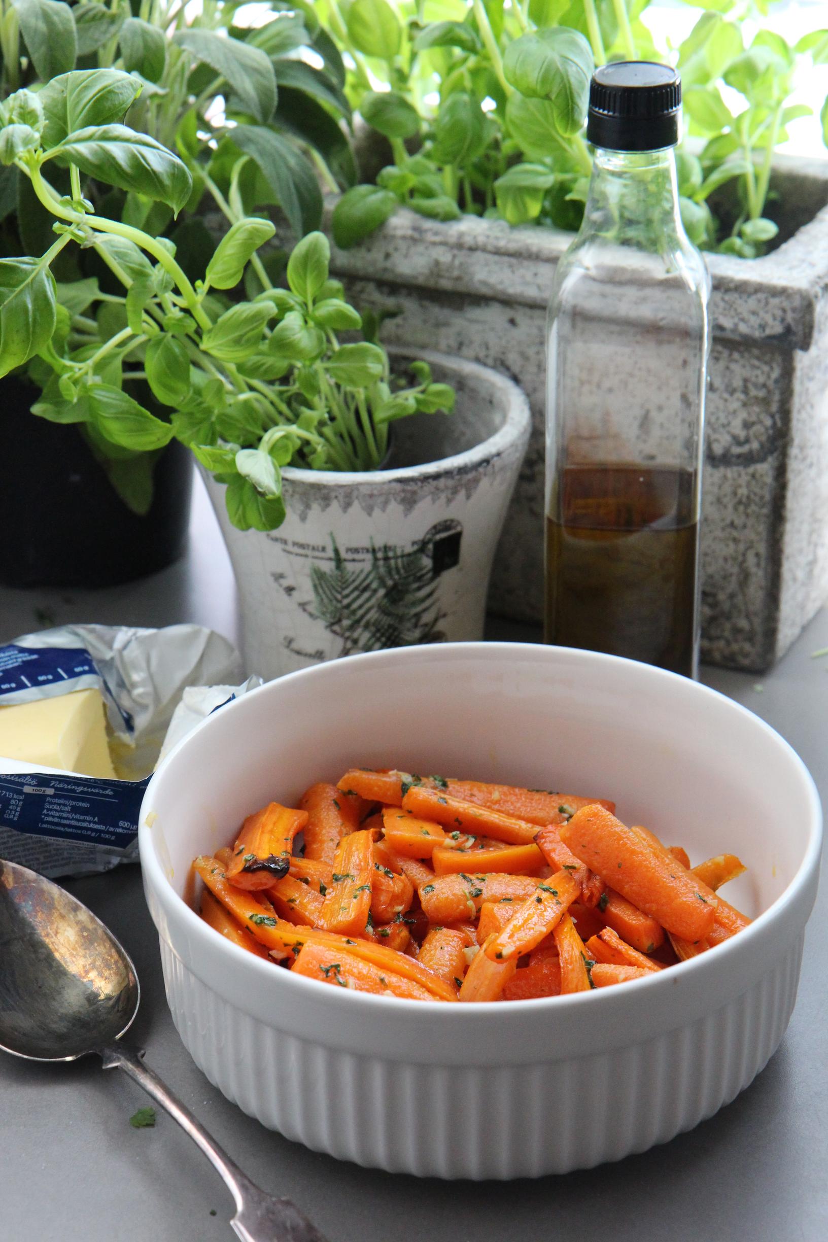 Pestään ja kuoritaan porkkanat. Leikataan poikittain halki ja pitkittäin useaan osaan. Levitetään porkkanat vuokaan ja ripotellaan oliiviöljyä päälle. Paistetaan 180 asteessa yhteensä noin puolisen tuntia. Paistamisen välissä sulatetaan voi pannussa, annetaan hiukan ruskistua, lisätään silputut valkosipulit sekä persilja ja annetaan hetken aikaa muhia. Sekoitetaan seos melkein kypsien porkkanoiden kanssa ja pidetään porkkanoita vielä uunissa hetken aikaa.