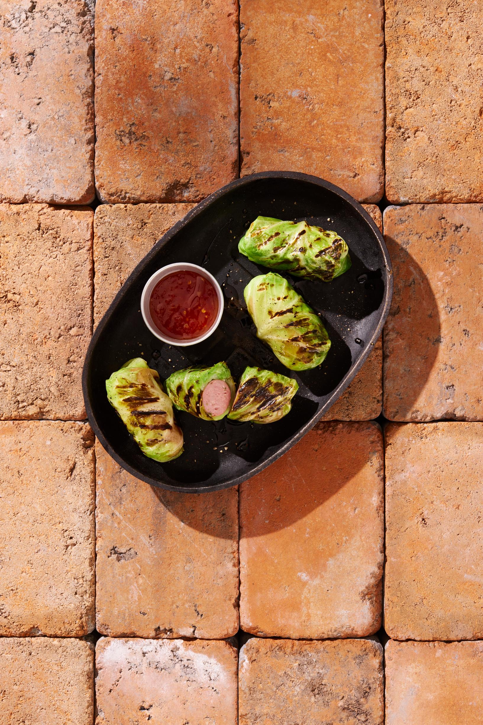 Tee varhaiskaalin isoimmista lehdistä makkaratäytteisiin grillinyytteihin syötävät kuoret. Tarjoa rapeaksi grillatut kesäkaalikääryleet maukkaan dippikastikkeen kanssa.