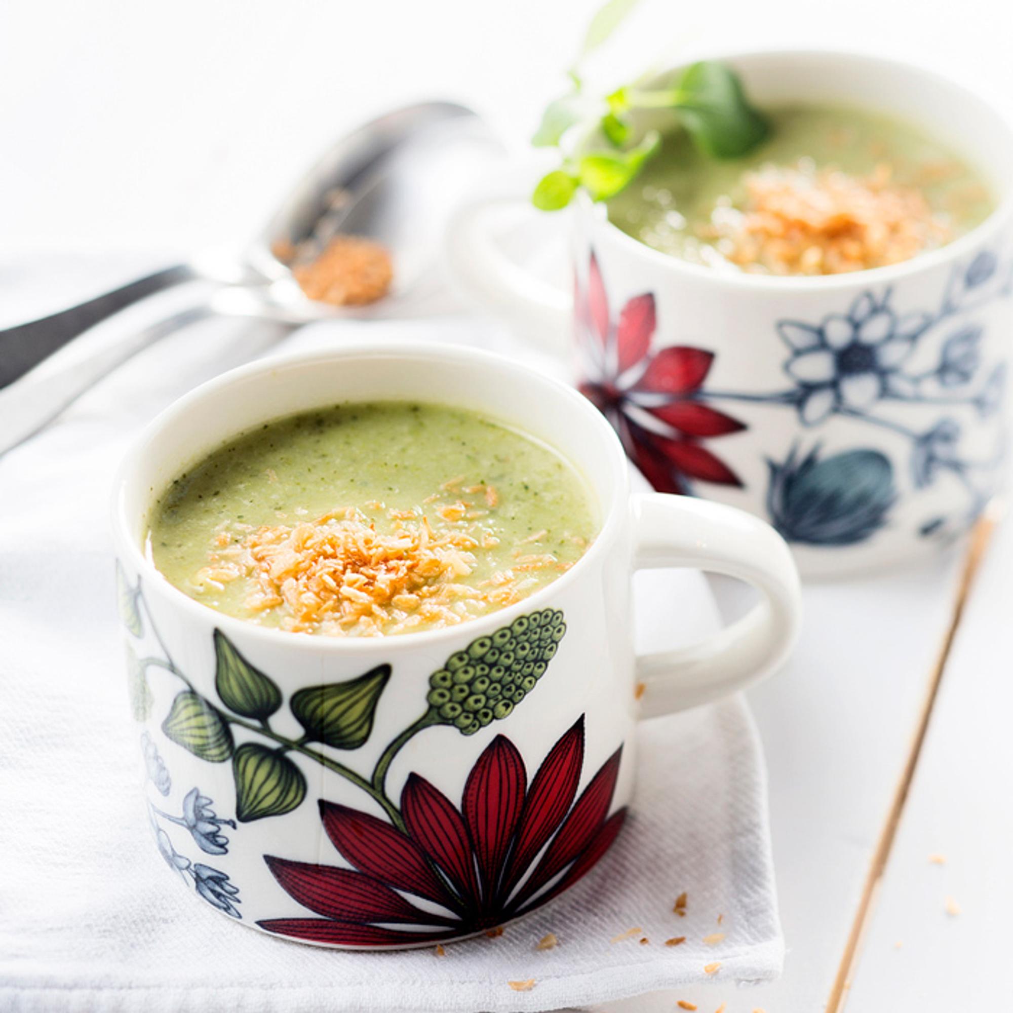 Paahda kookoshiutaleet pannulla kevyesti. Tarjoa ne erikseen. Tarjoa kaali-kookoskeitto tuoreen leivän (tarvittaessa gluteenittoman) kanssa.