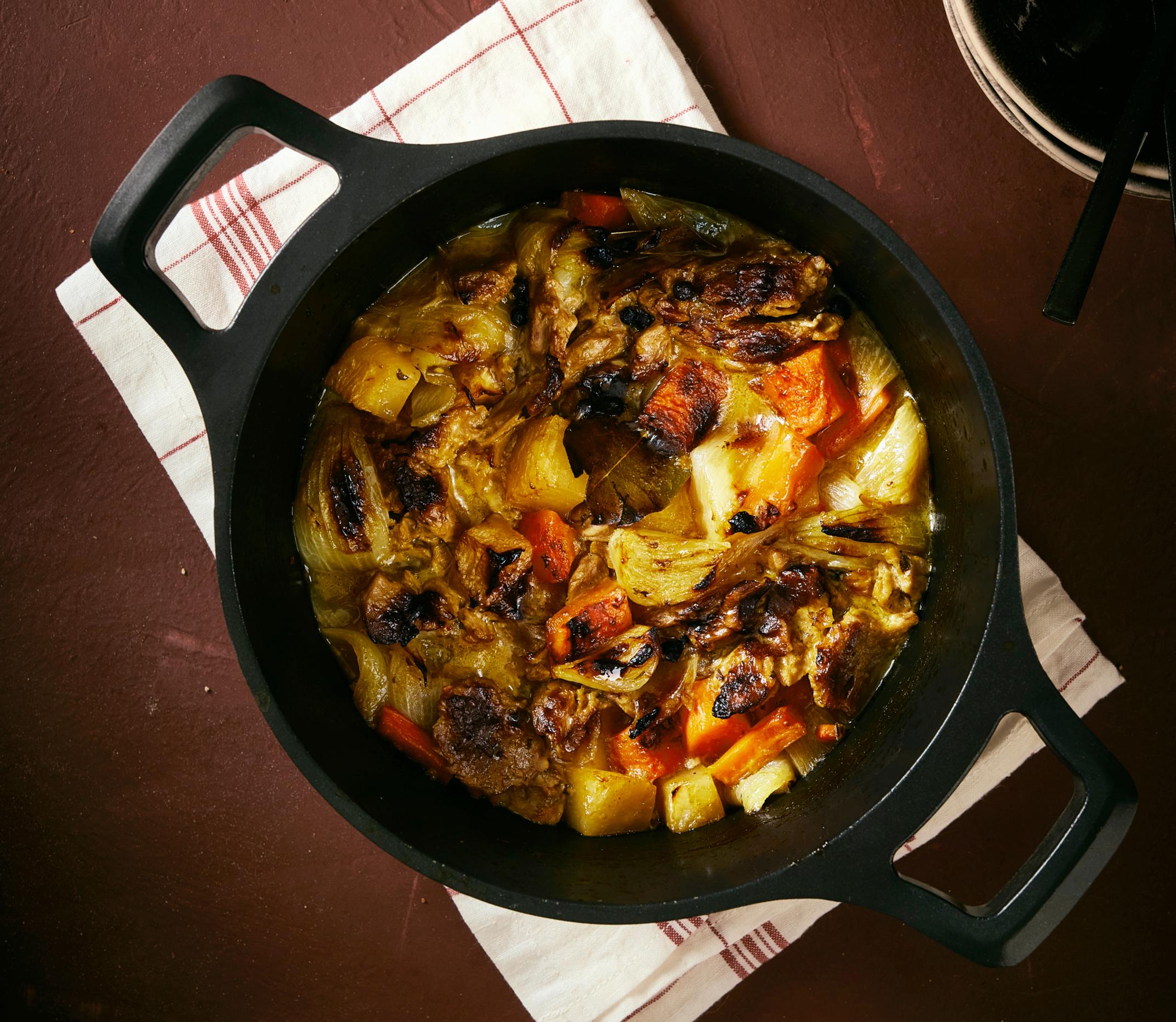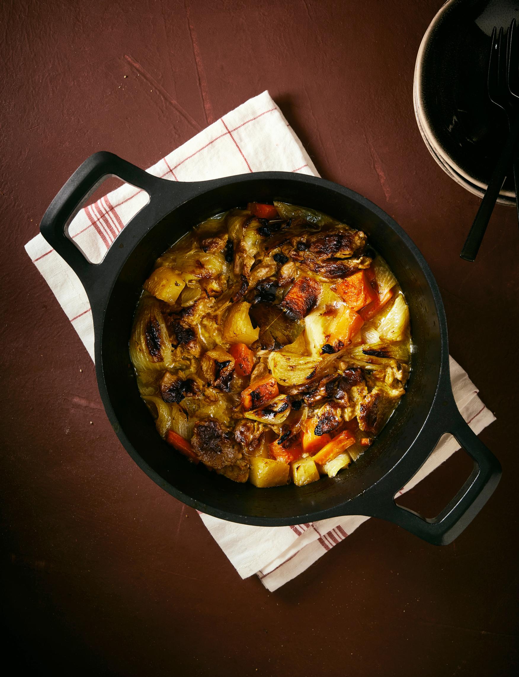 - Lisää kasvisliemi ja muut mausteet. Peitä pata kannella tai foliolla ja kypsennä uunissa 175-asteessa noin tunti, kunnes juurekset ovat pehmenneet.