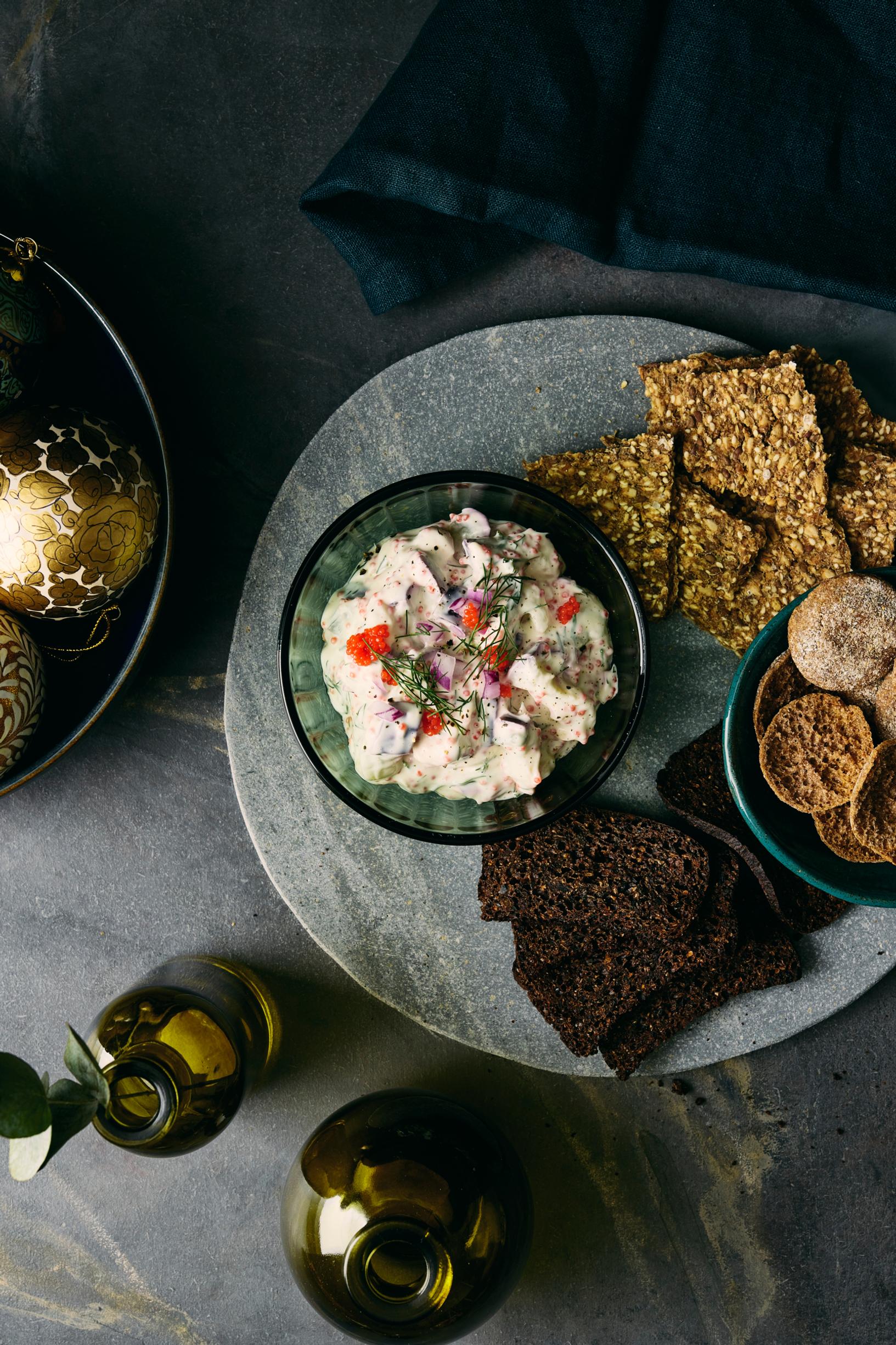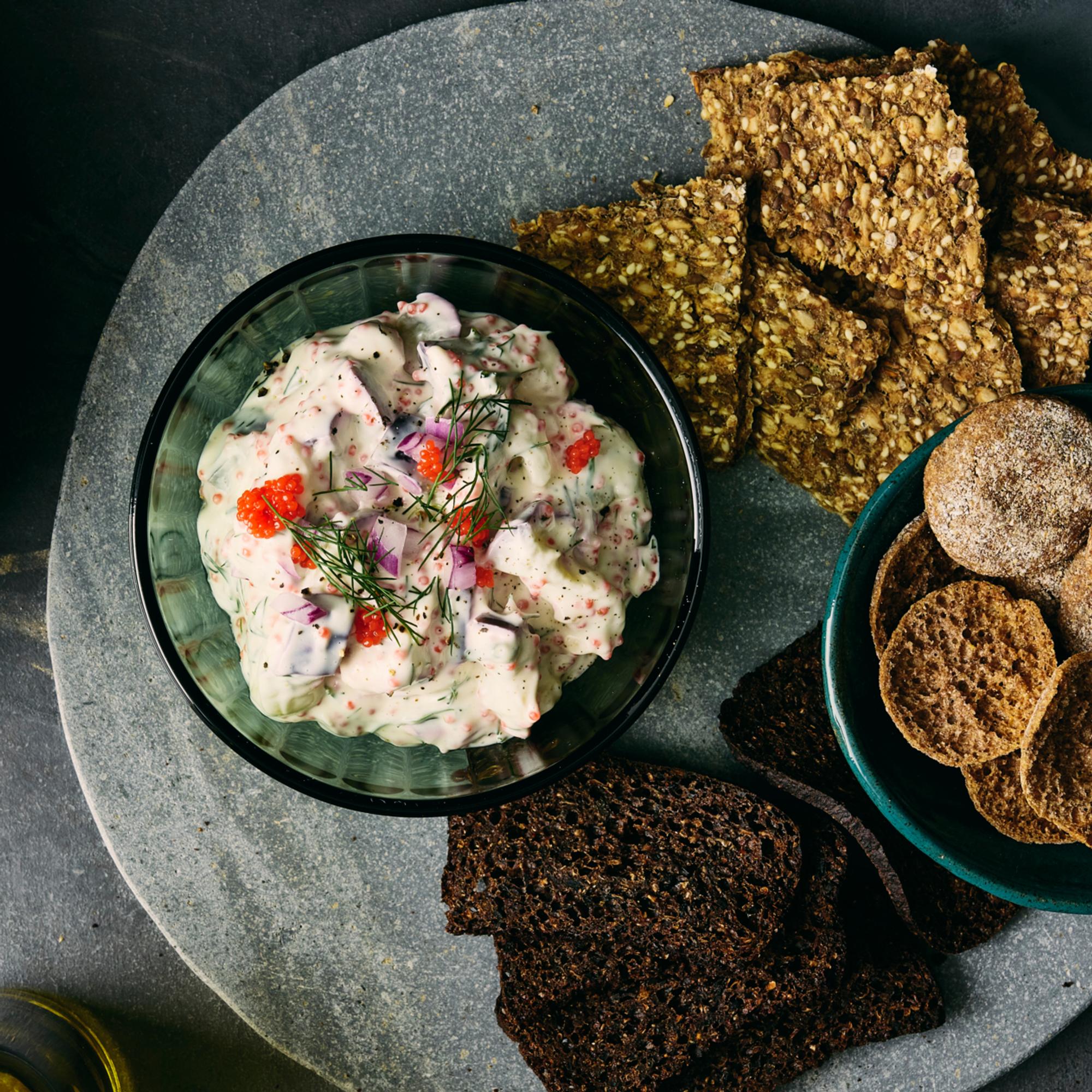 - Kuori ja hienonna punasipuli. Hienonna tilli. Sekoita kulhossa kaura¬fraiche, majoneesi, sipulit, tilli, merilevävalmiste, sitruunanmehu, sinappi, pippuri, suola ja sokeri.