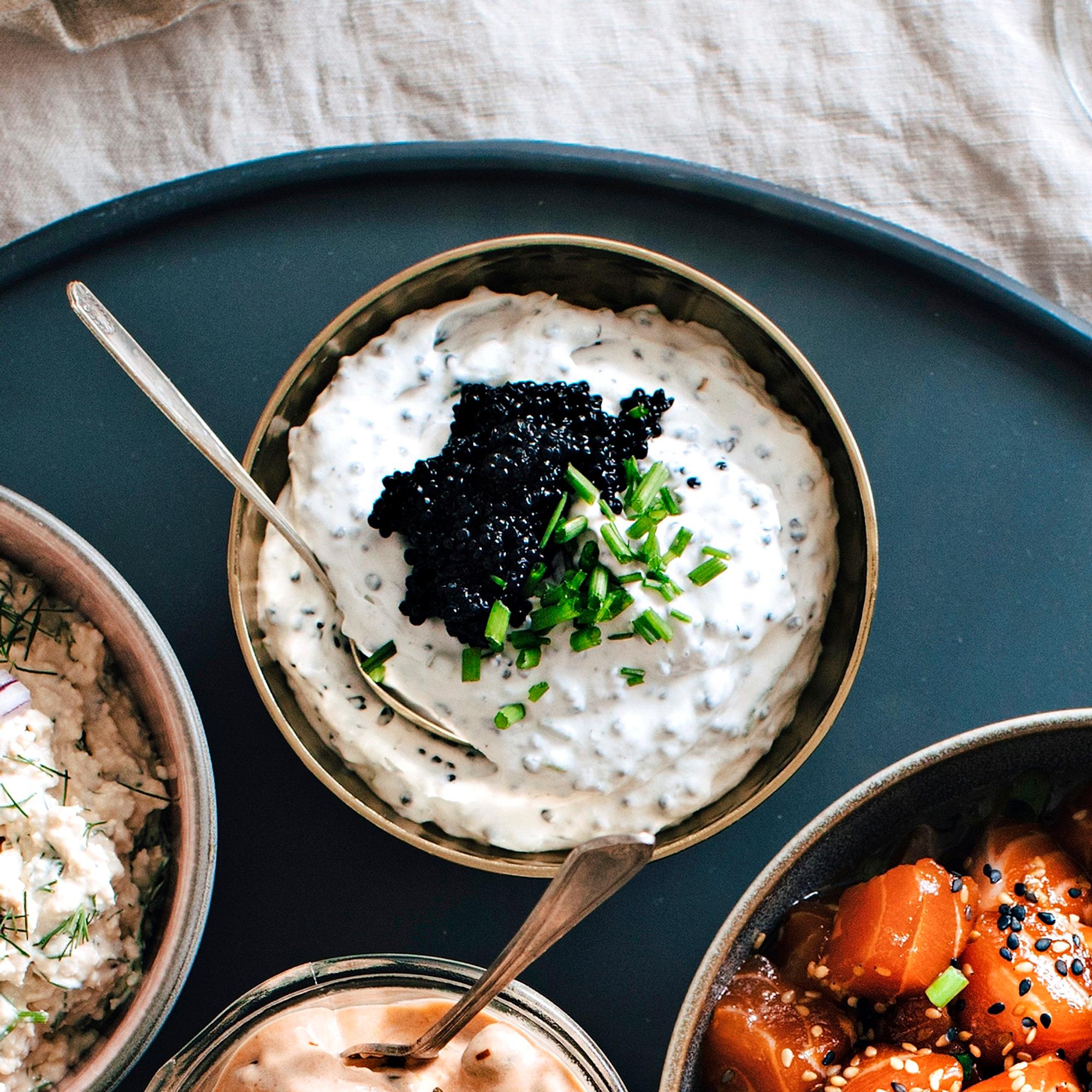 Vegaaninen mätitahna on juhlava vaihtoehto kasvissyöjille tai kala-allergikoille. Kaurapohjaiseen tahnaan lisätään mätiä jäljittelevää merilevävalmistetta.
