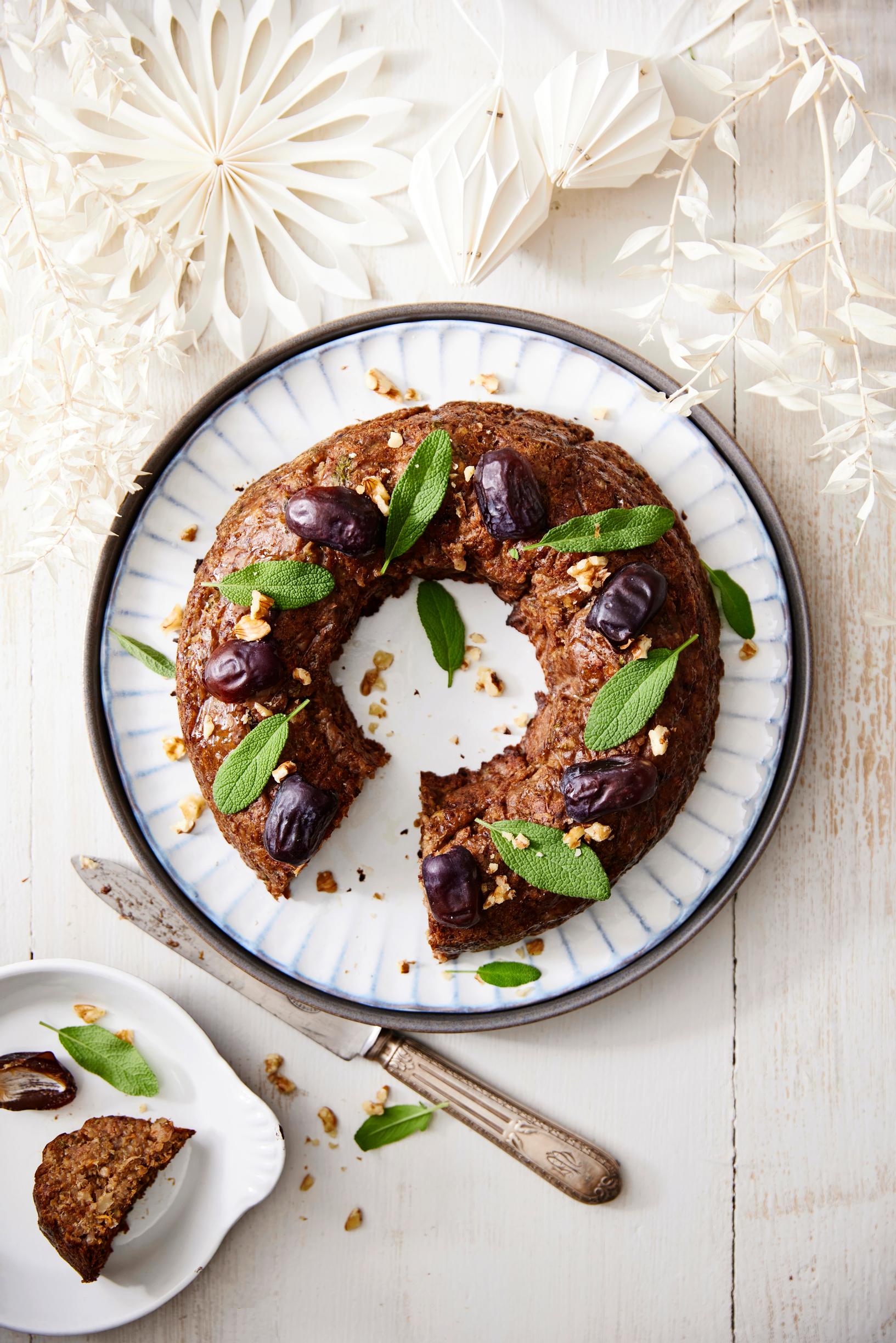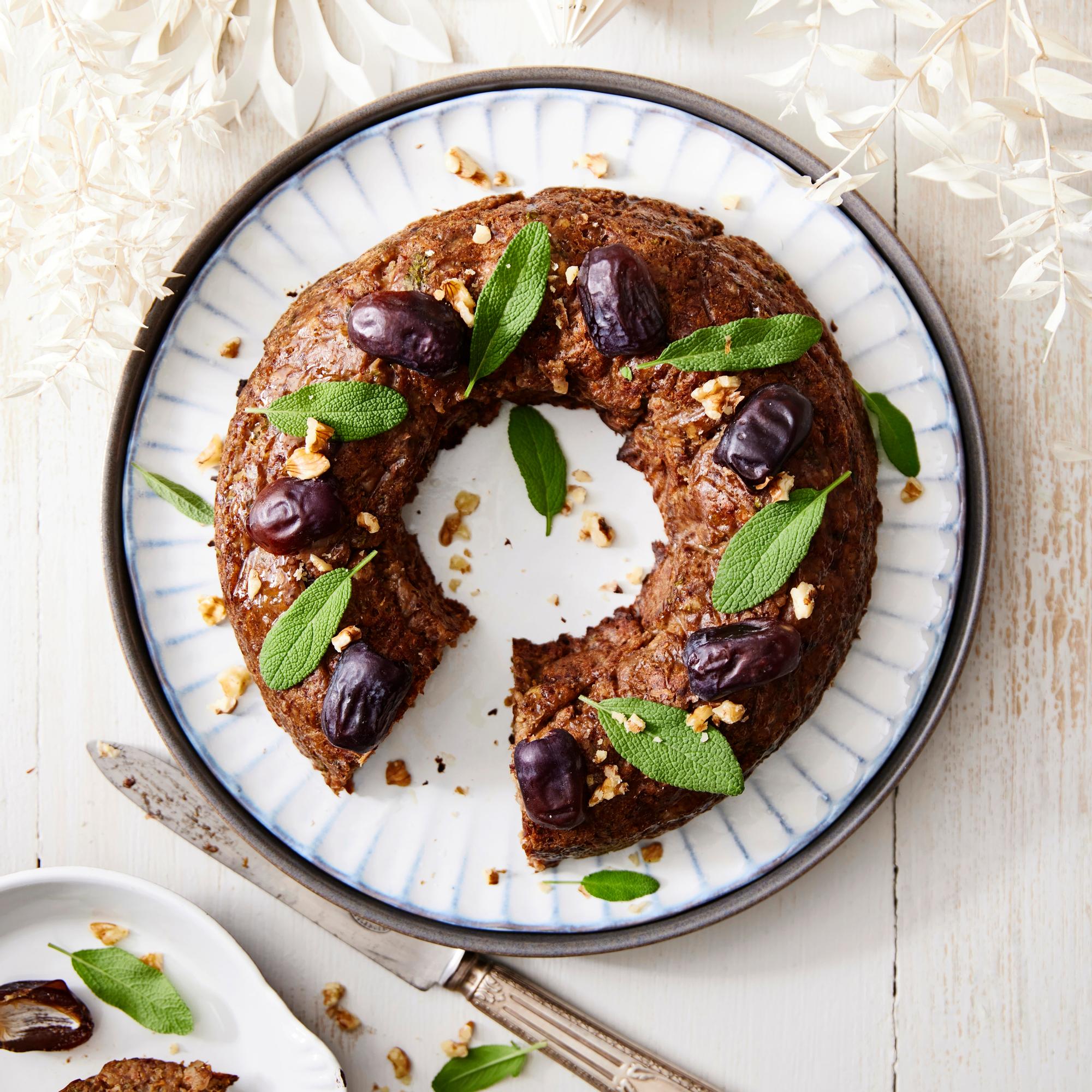- Halkaise taatelit ja poista niistä kivet. Koristele mureke taateleilla, salvianlehdillä ja saksanpähkinärouheella.