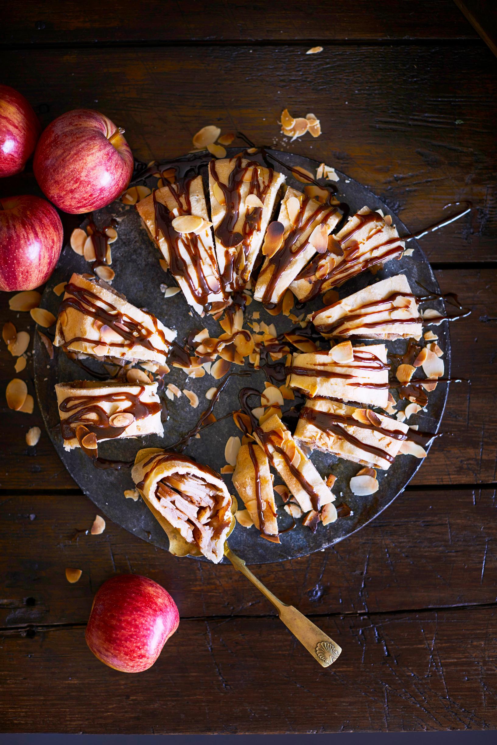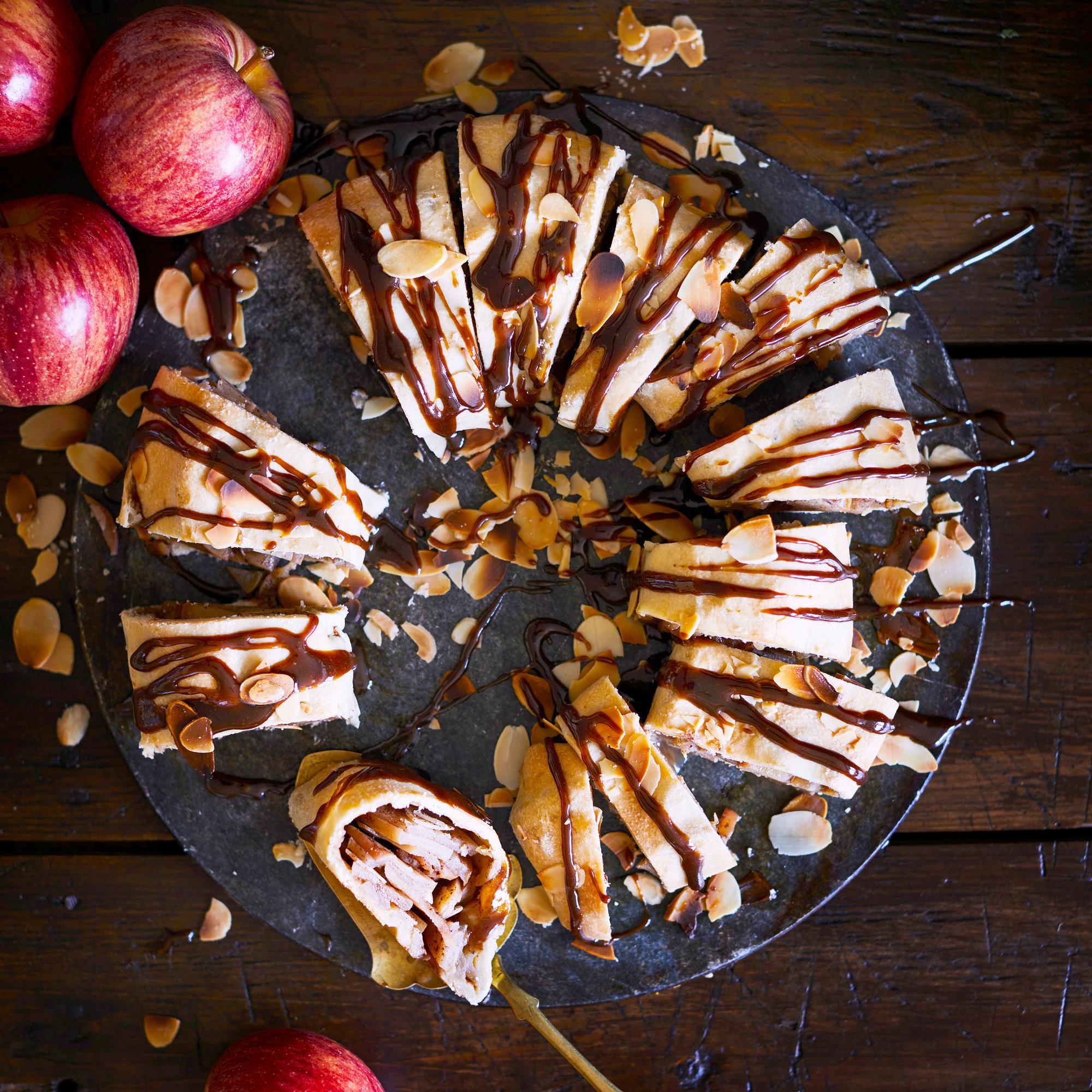 Vegaaninen omenastruudeli maistuu kanelilta, kardemummalta ja calvadoksella maustettuilta omenalohkoilta. Muscovadokinuski ja mantelilastut kruunaavat leivonnaisen. Nyt herkutellaan!
