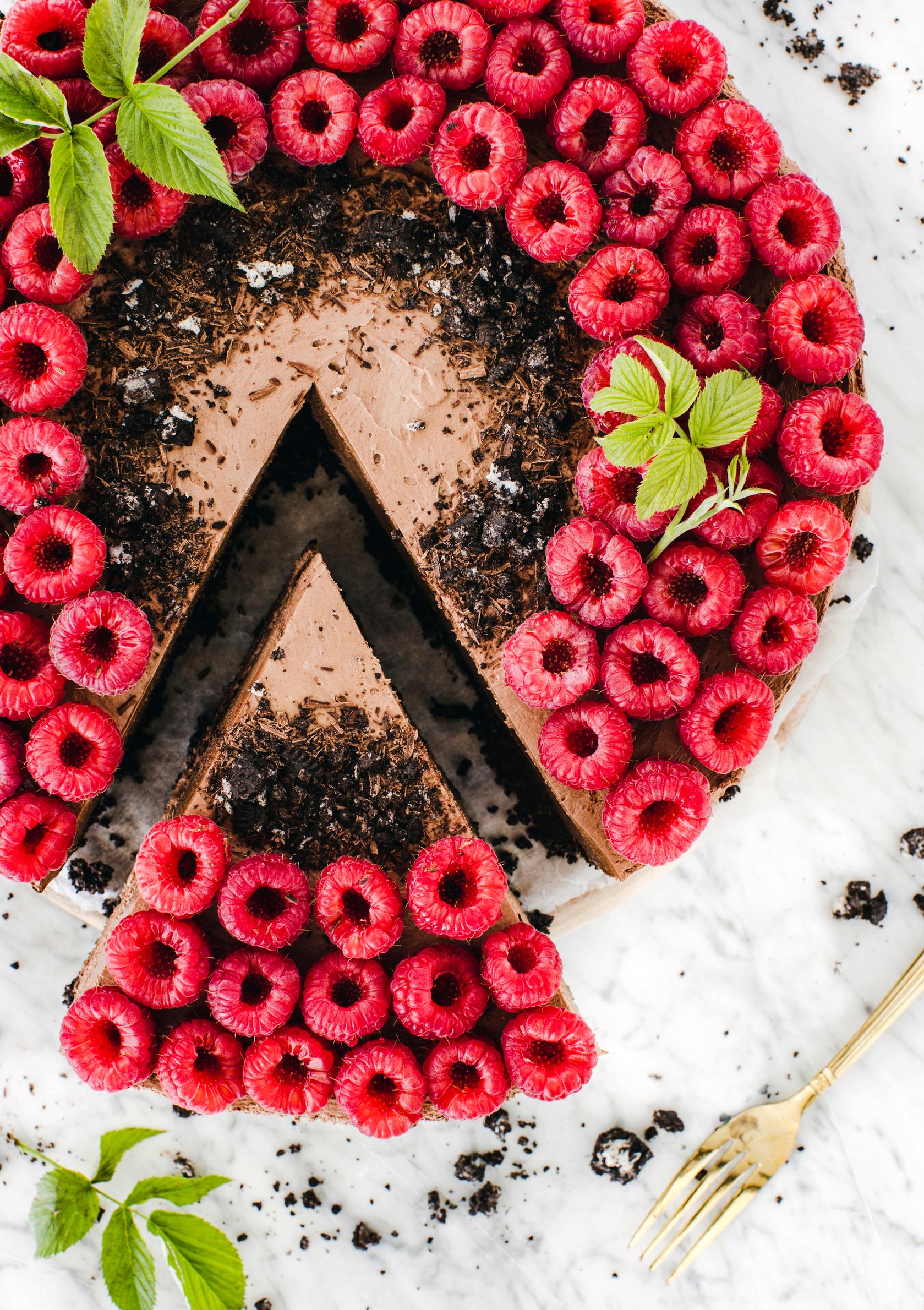 Vegaaninen suklaamoussekakku – kuohkea unelmaherkku täytekeksipohjalla ja vadelmakoristeilla