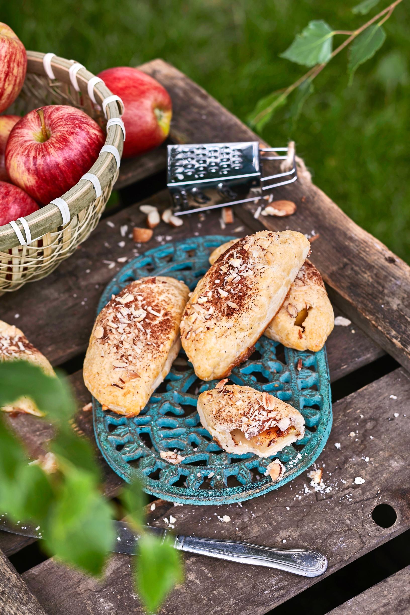 - Jaa taikina noin 12 osaan. Taputtele jokainen pala noin 10 sentin kokoiseksi pohjaksi. Nosta omenaviipale jokaiselle pohjalle. Ripottele päälle kookossokeria ja kanelia. Sulje nyytti niin, että omena jää sisään.