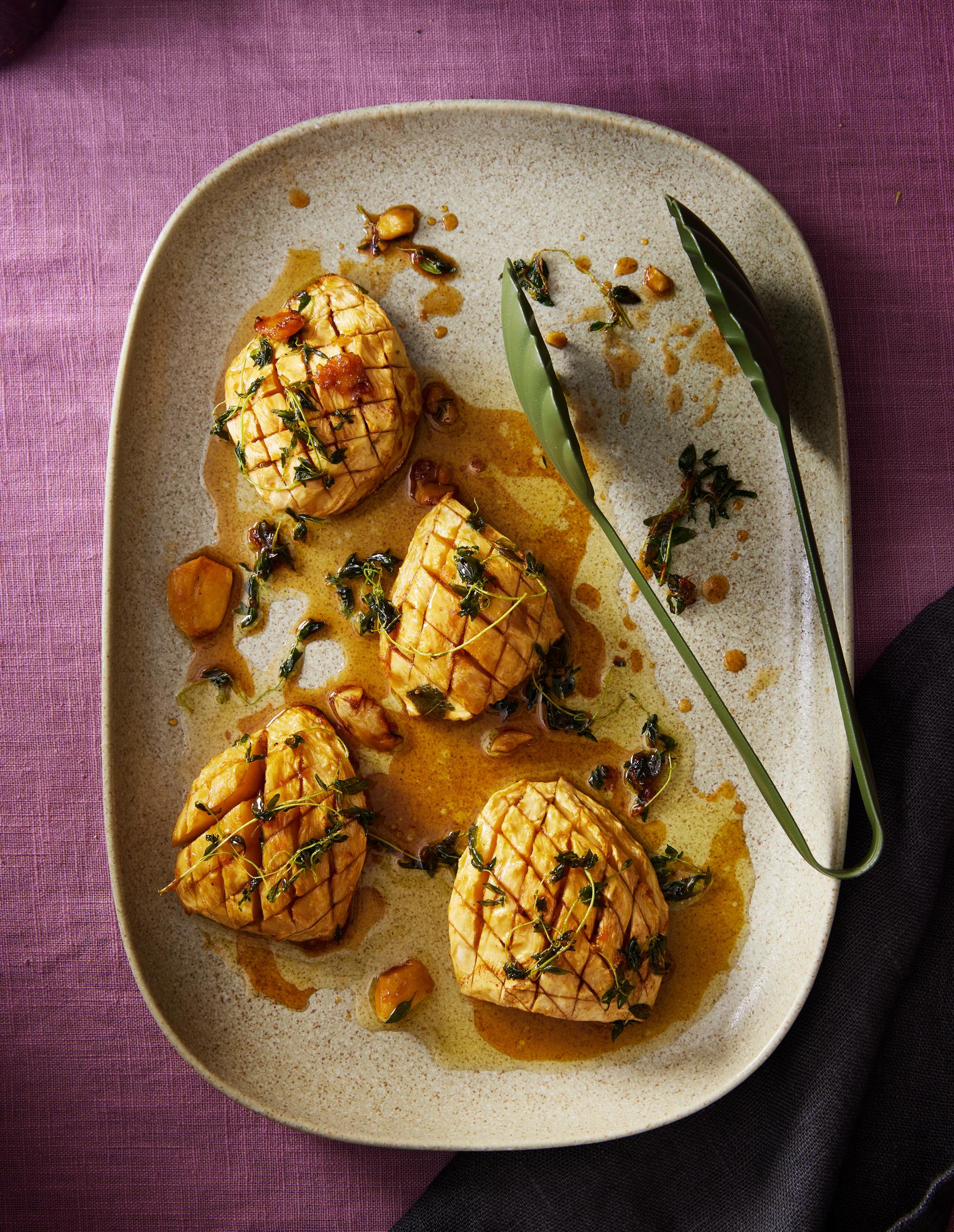 - Hienonna valkosipulinkynnet. Paista vegeankat pannulla juuri ennen tarjoamista. Sulata voi pannulla, lisää valkosipulit ja timjami. Paista selleripalat molemmin puolin, kunnes ne saavat hieman väriä pintaan.
