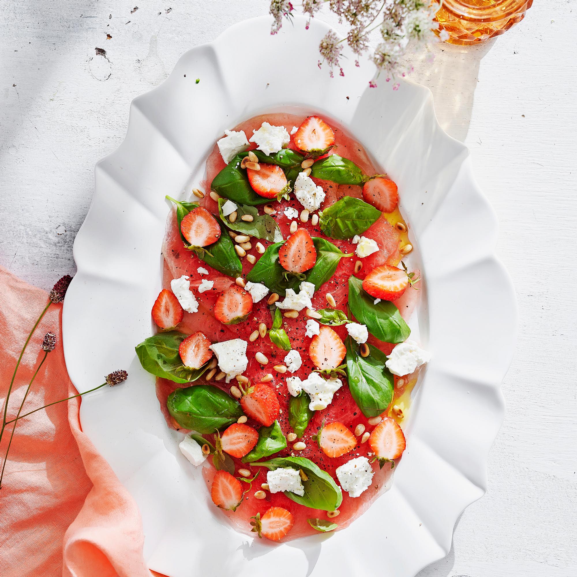 Raikas kesäcarpaccio kootaan vesimelonista, mansikoista, rouskuvista pinjansiemenistä ja suolaisesta fetasta. Saat vuoltua vesimelonista ohuita lastuja juustohöylällä. Nappaa resepti!