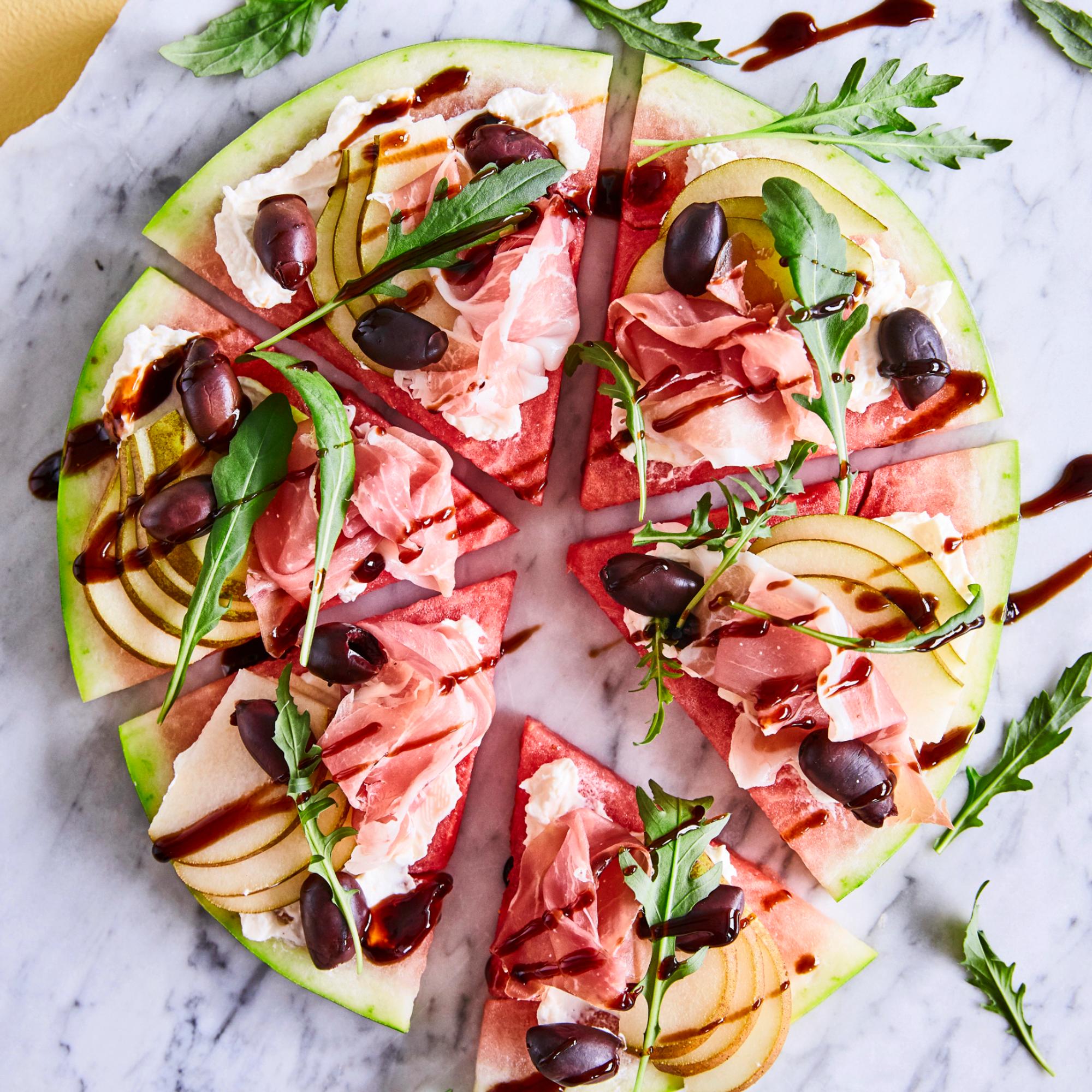 Vesimelonipizza on herkullinen yhdistelmä makeaa ja suolaista: raikasta vesimelonia, hedelmäistä päärynää, hapokasta fetavaahtoa, maukasta ilmakuivattua kinkkua sekä aromikkaita oliiveja. Vesimelonipizza toimii yhtä lailla niin jaettavan pikkupalana kuin hieman erilaisena aterian aloituksena.