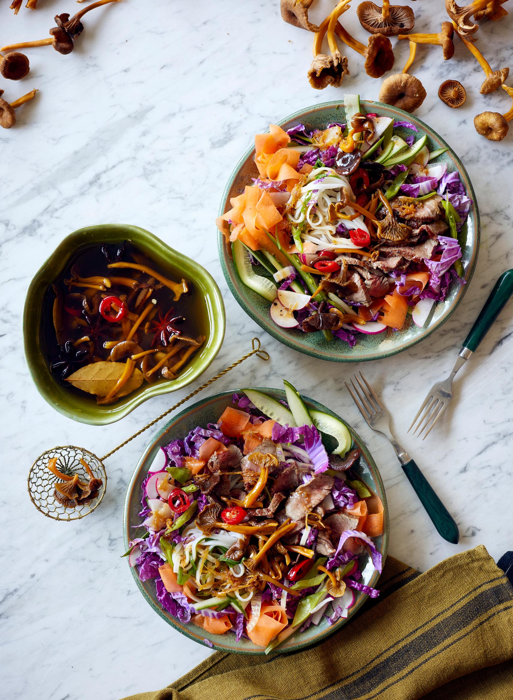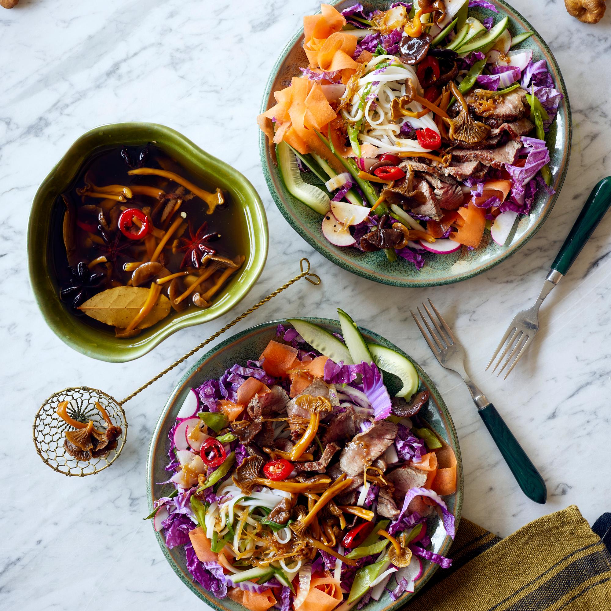Vietnamilaisen keittiön inspiroima pihvisalaatti on täyttävä ja näyttävä annos. Pikkelöidyt suppilovahverot ovat salaatin salainen ainesosa.