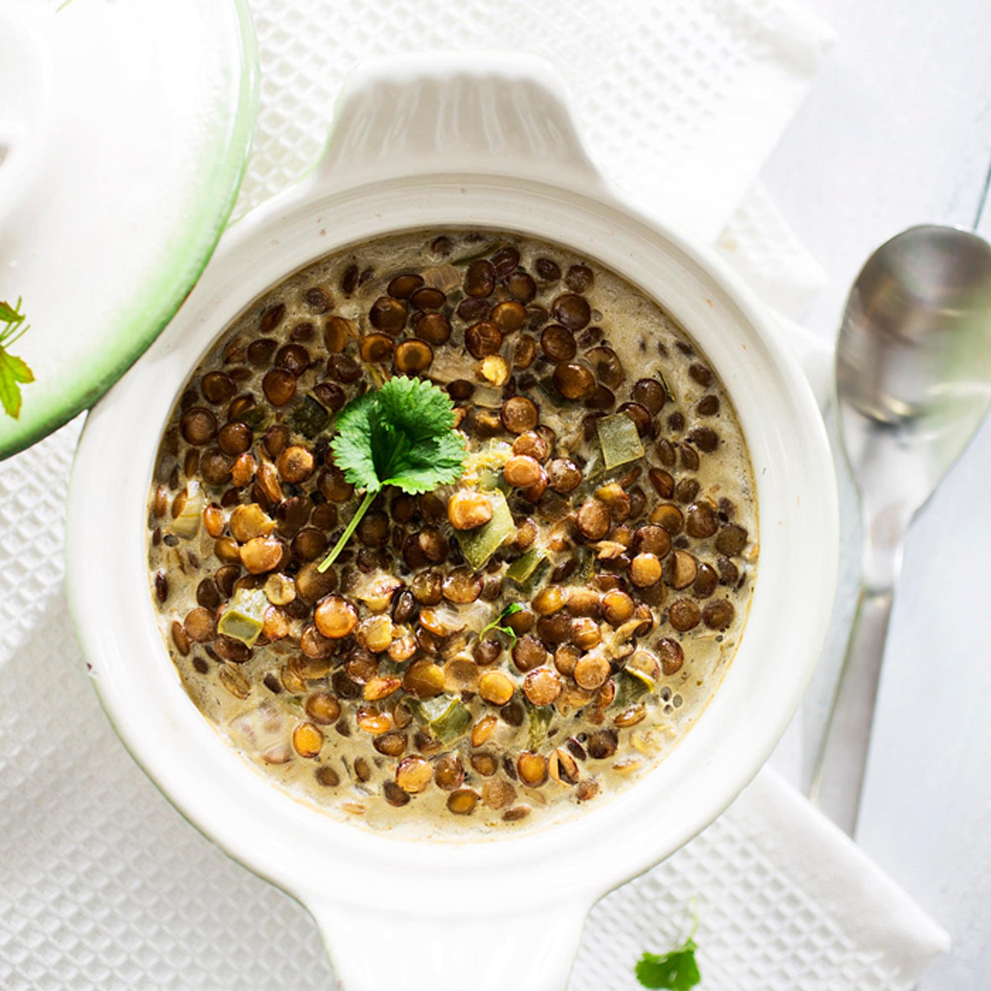 Kiehauta currytahna öljyssä paistokasarissa. Kuullota siinä sipulit ja paprikat. Sekoita joukkoon valutetut linssit. Kaada päälle kasvisliemi. Kuumenna kiehuvaksi ja keitä miedolla lämmöllä kannen alla 15 minuuttia. Lisää soijakerma ja keitä ilman kantta vielä noin 10 minuuttia, jolloin kastike sakenee.