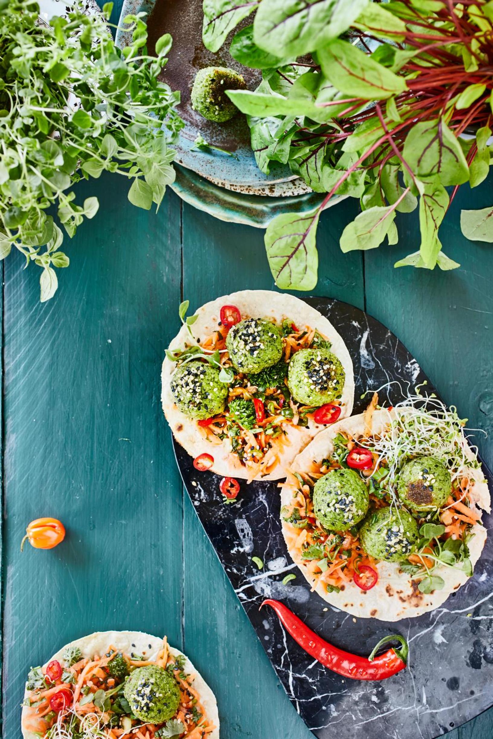 - Paista falafelejä 200-asteisessa uunissa 15 minuuttia. Tarjoa vihreitä falafeleja tortillojen täytteenä yhdessä aasialaisen porkkanaraasteen kanssa.