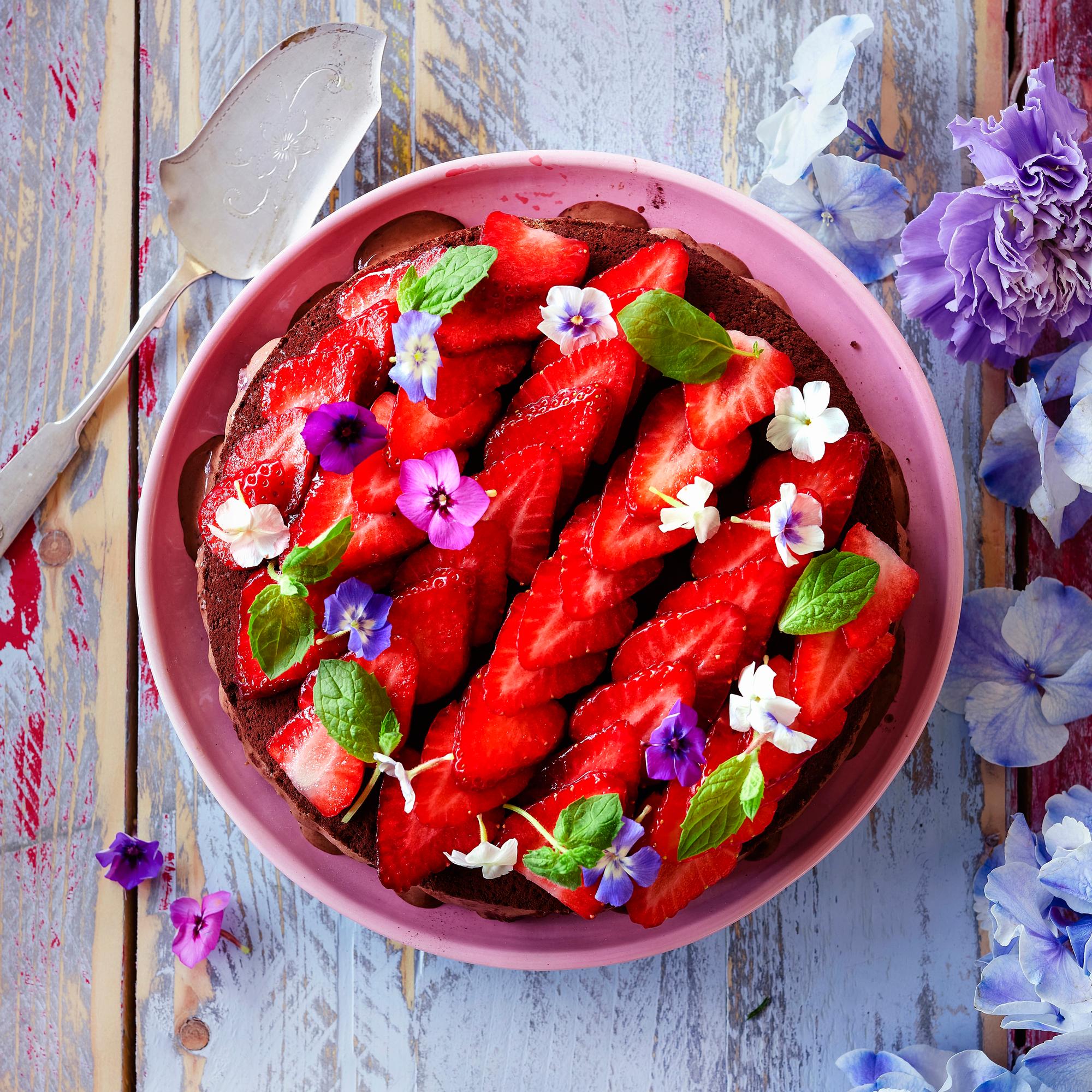 Viiden aineksen mansikka-suklaakakku on herkku, jonka tohtii tehdä helteilläkin. Kokoa mansikat kakun päällä siisteihin riveihin tai anna luovuutesi kukkia!
