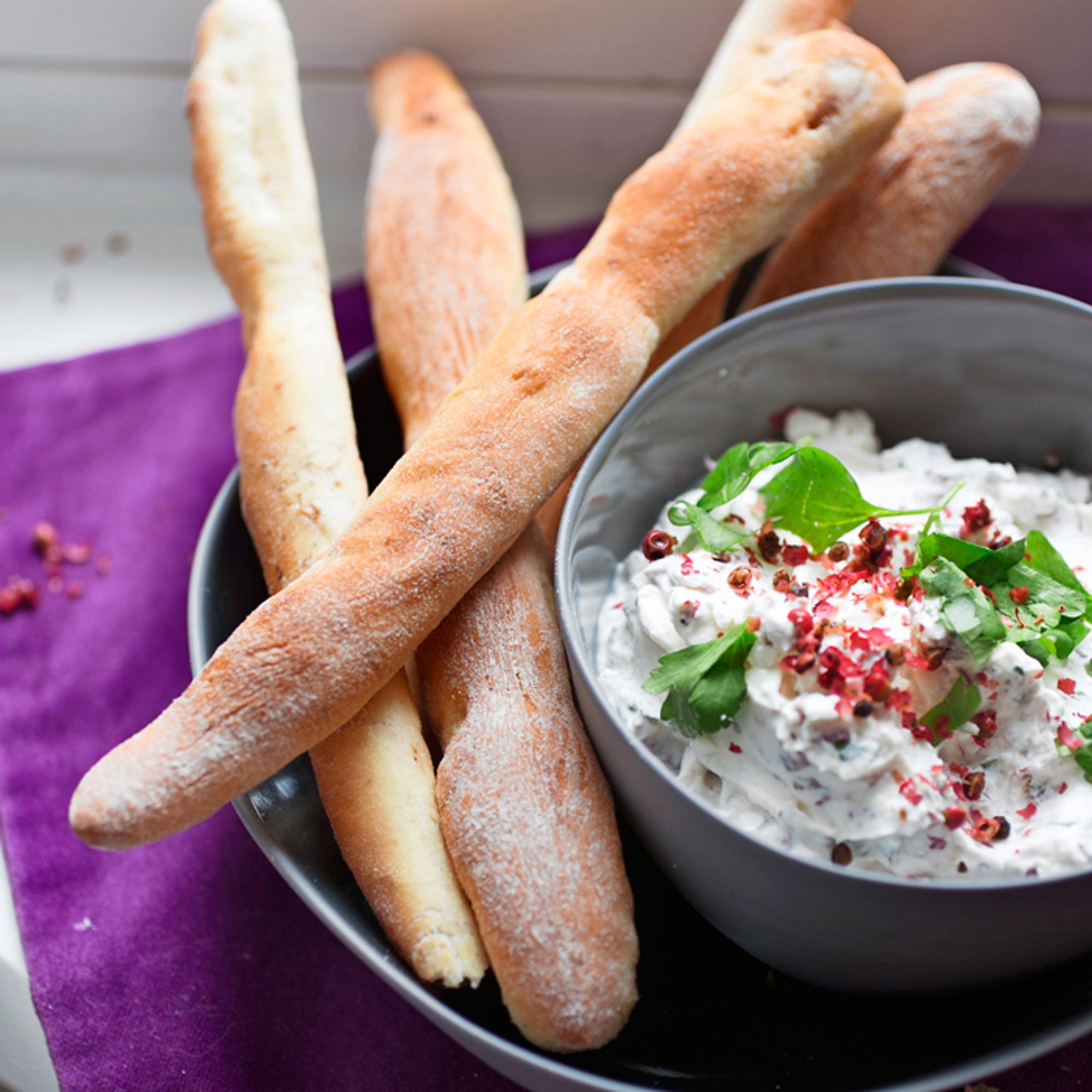 Ihanat viikunagrissinit saavat dipikseen maukkaan porotahnan. Makea viikuna, suolainen kylmäsavuporo ja kirpsakka piparjuuri toimivat upeasti yhdessä!