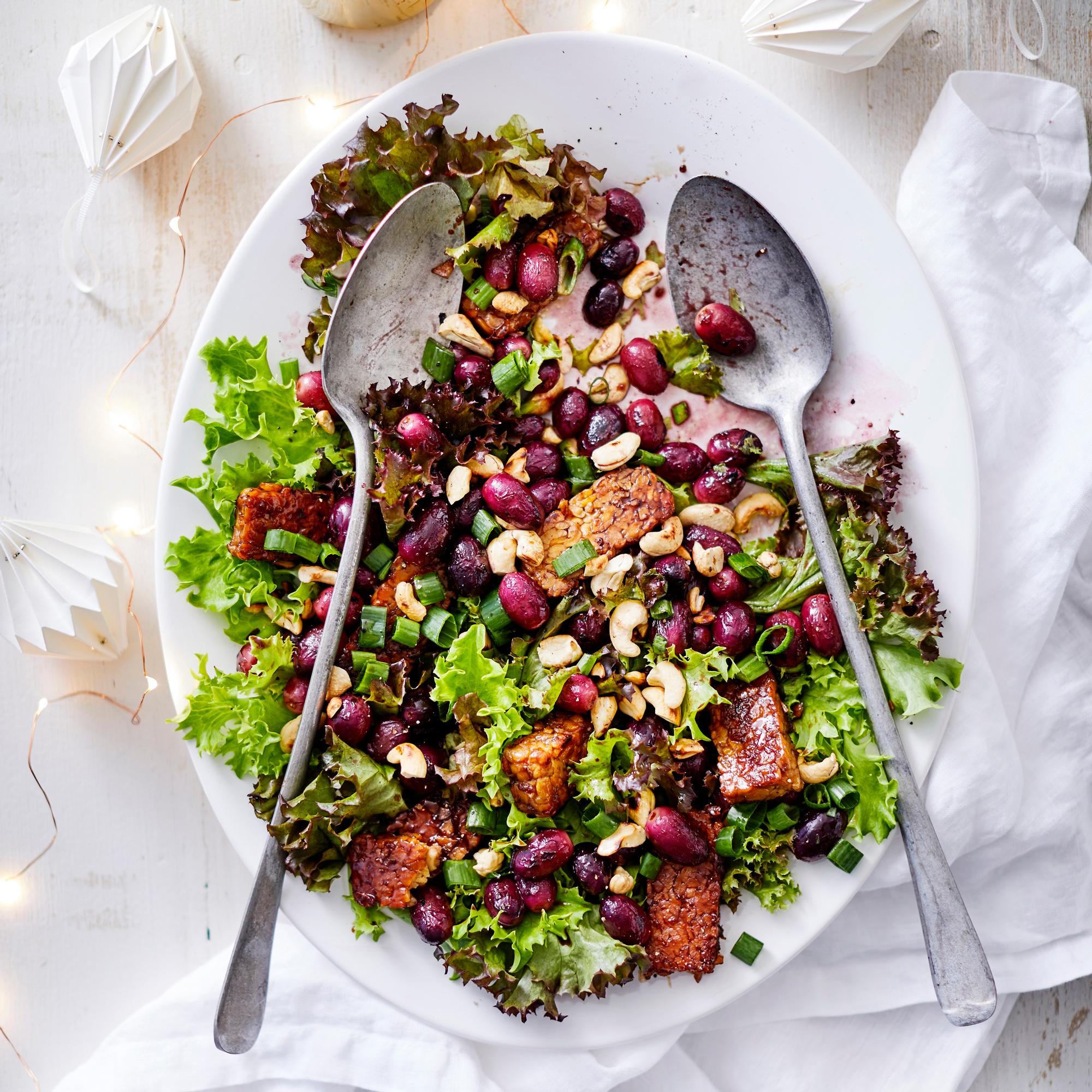 Joulupöydän herkullisin salaatti! Viinirypäle-tempehsalaatti yhdistää pähkinöiden, tummien rypäleiden ja makeansuolaiseksi marinoidun tempehin