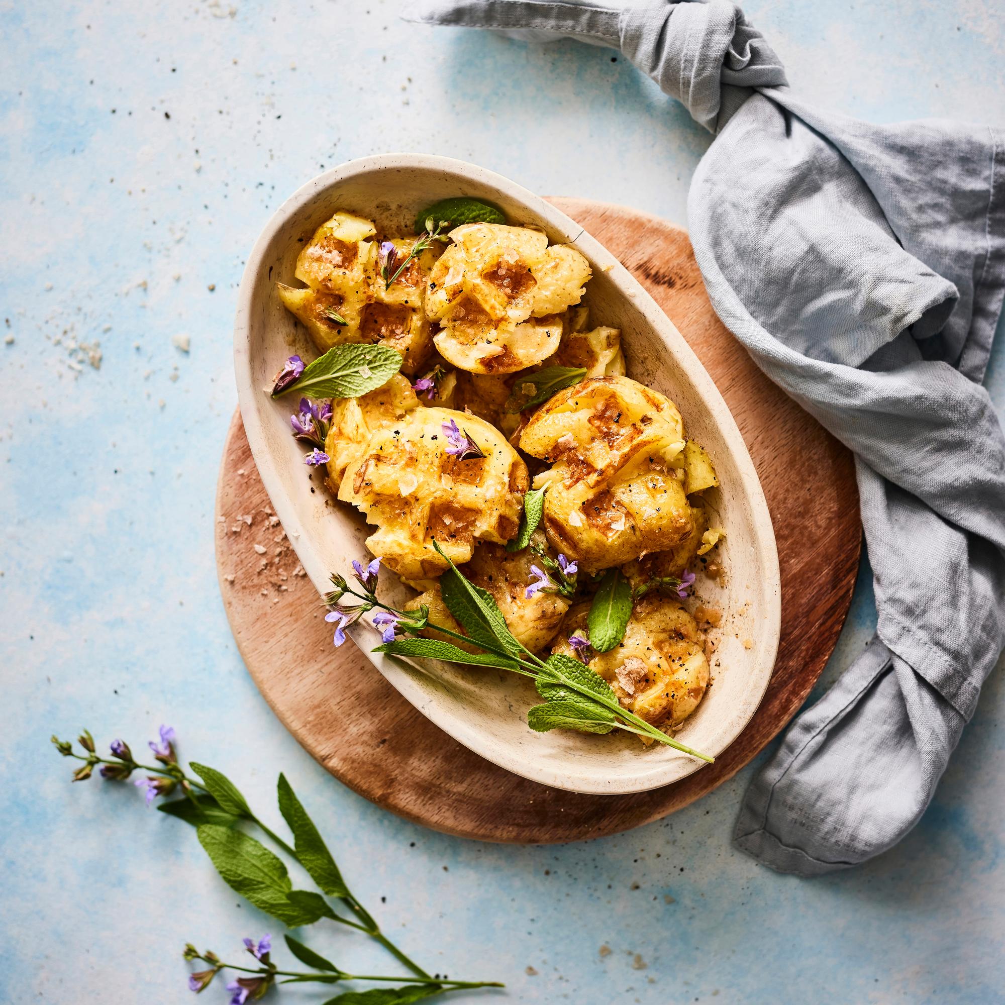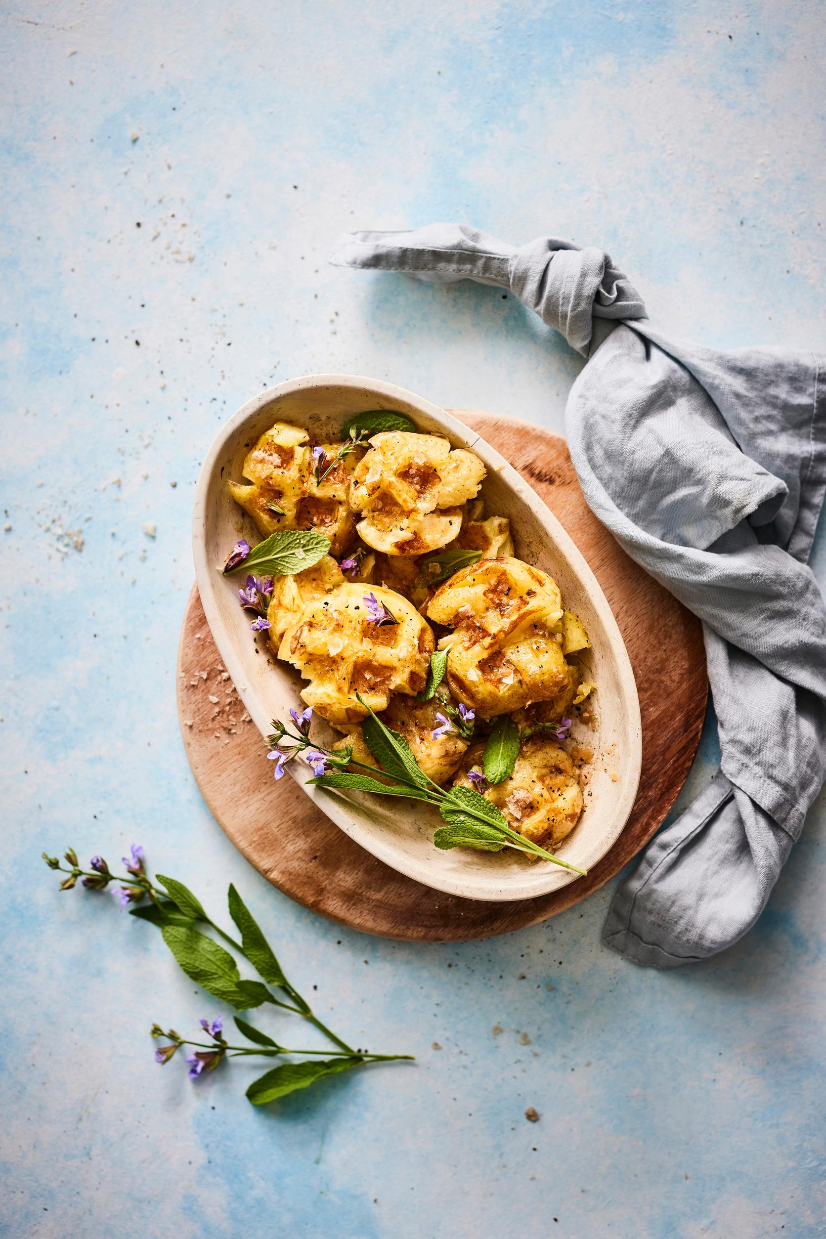 - Paina hieman jäähtyneet perunat litteiksi esimerkiksi nyrkillä tai puulastalla.